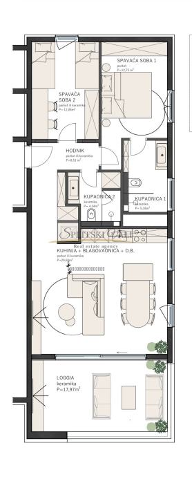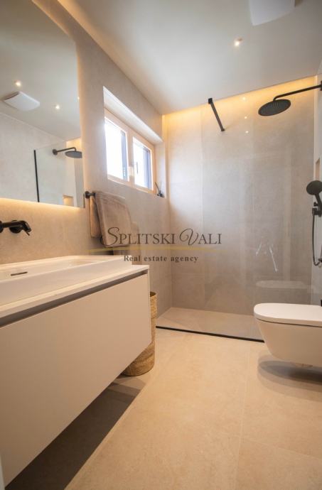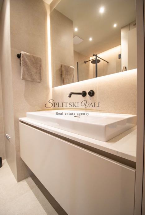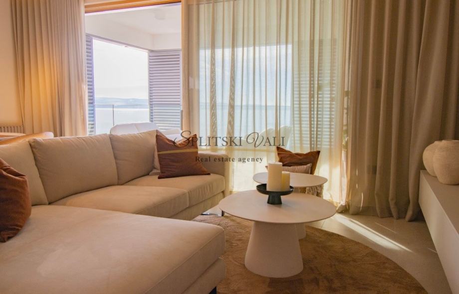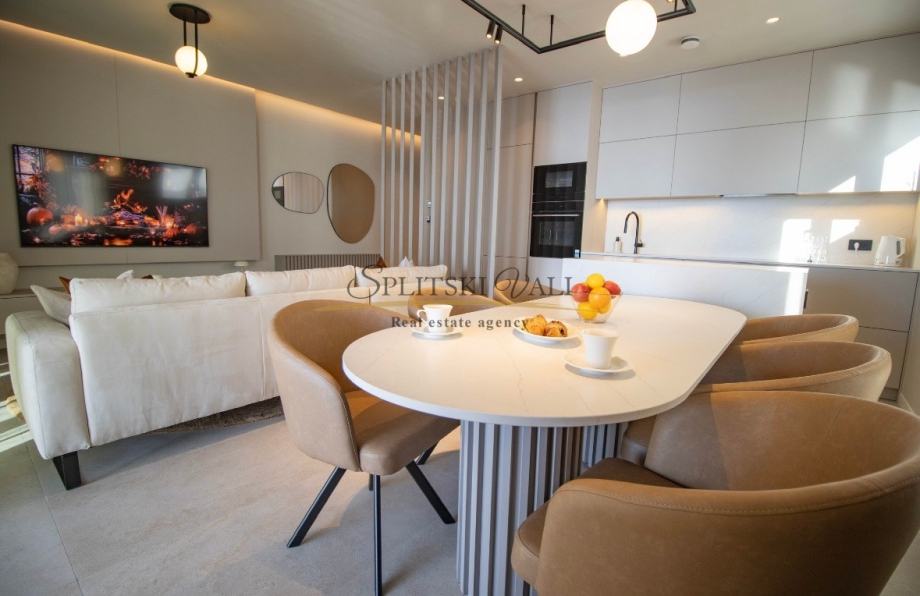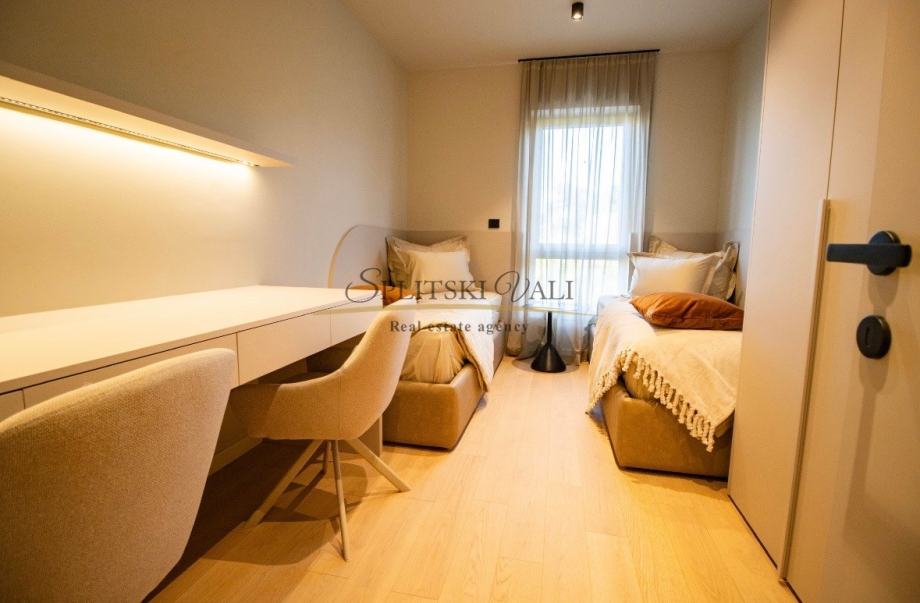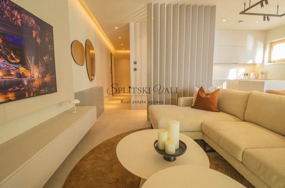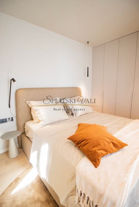 Posredujemo u dugoročnom najmu luksuznog dvosobnog stana korisne površine 90,67m2 koji se nalazi u ekskluzivnoj novogradnji “Bel Etage 2” s iznimnim pogledom na more. Sastoji se od hodnika, kuhinje s blagovaonicom i dnevnog boravka, dvije spavaće sobe, dvije kupaonice te lođe. Stanu su dostupna na korištenje 2 parkirna mjesta u podzemnoj garaži objekta te sprema u podzemnoj etaži. Preko sustava „Pametnog stana“ svojim pametnim telefonom upravljate rasvjetom, roletama, klimatizacijskim i parlafonskim sustavom. Stanovi su klimatizirani Daikin dizalicom topline s pripremom tople vode i podnim grijanjem. Zgrada ima videonadzor, recepciju, teretanu i saunu.