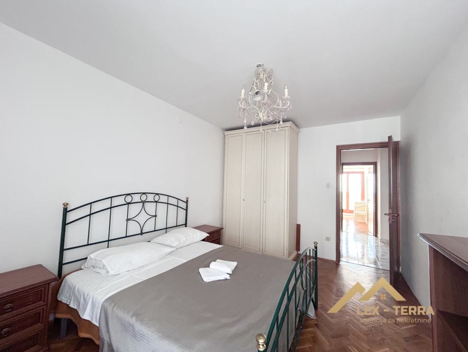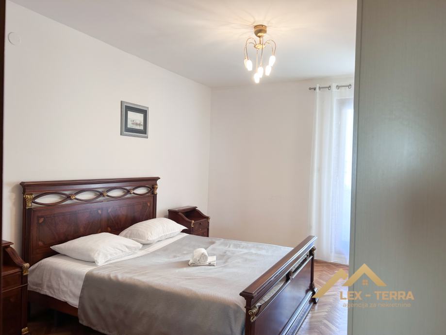 Potpuno namješten, stan se sastoji od četiri spavaće sobe, prostranog dnevnog boravka s izlazom na lođu, dvije kupaonice te dodatnog gostinjskog WC-a. Klimatiziran je s dvije klima jedinice, a južna orijentacija osigurava sunce tijekom cijelog dana.