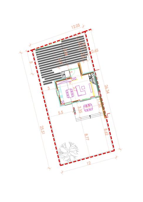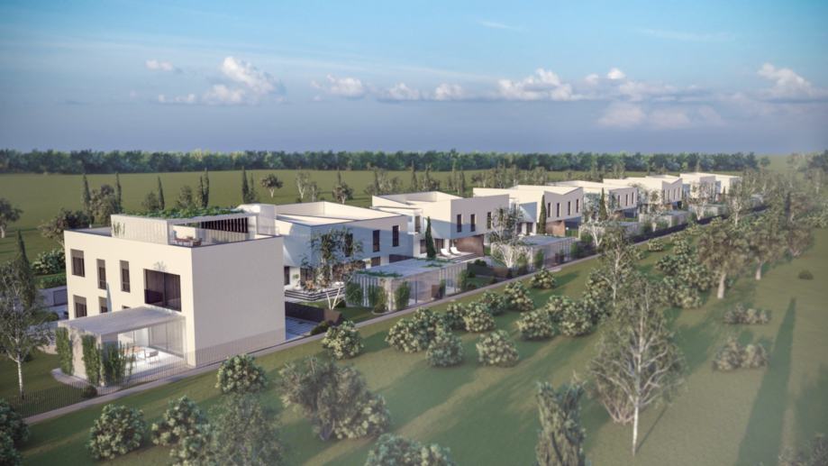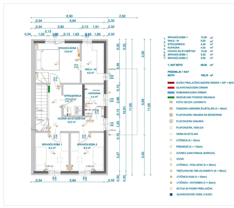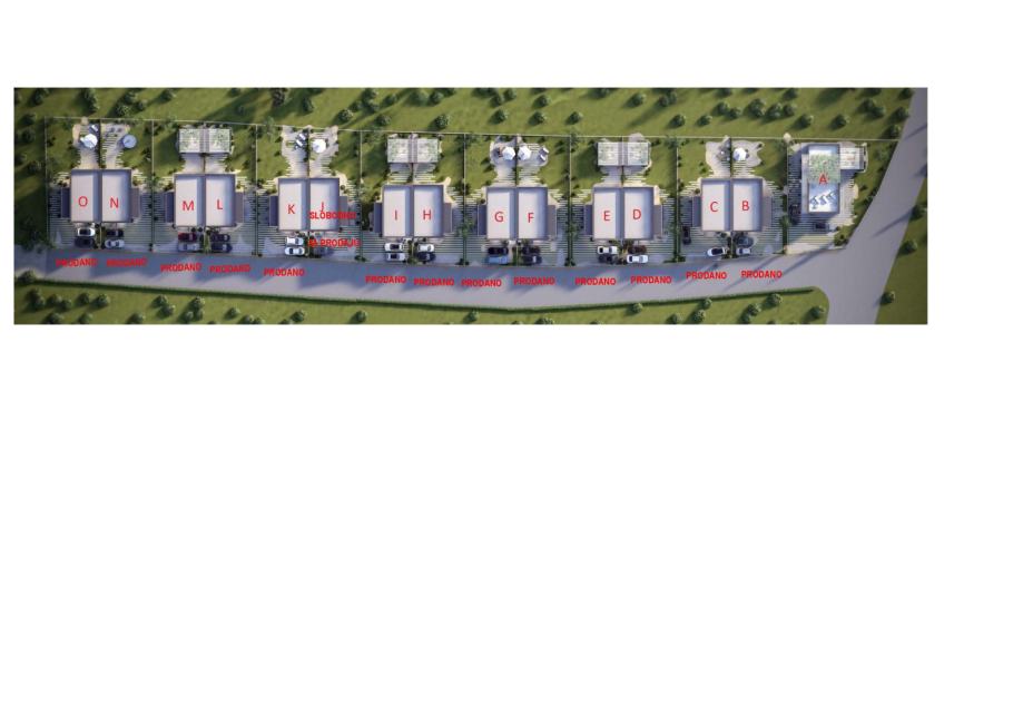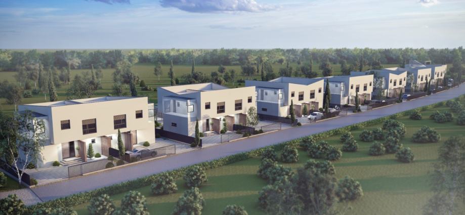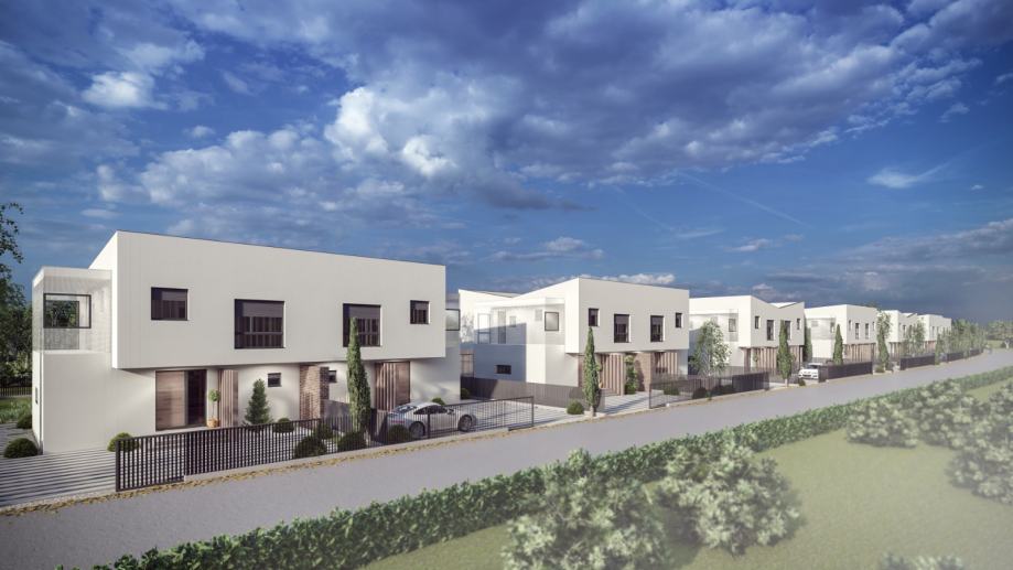 Kuća će biti izgrađena na dvije etaže, prizemlje i kat. Prizemlje se sastoji od ulaznog trijema. dnevnog boravak, kuhinje i blagovaonice otvorenog tlocrta s izlazom na natkrivenu terasu 20,30 m2 i dvorište 250 metara. Na katu se nalaze master soba s pripadajućom kupaonicom i garderobom, dvije spavaće sobe, kupaonica i nenatkrivena terasa 12,10 m2. U sklopu dvorišta kuće su dva parkirna mjesta svako po 12,50 m2 s prednje strane kuća, a otraga pripadajući vrt.