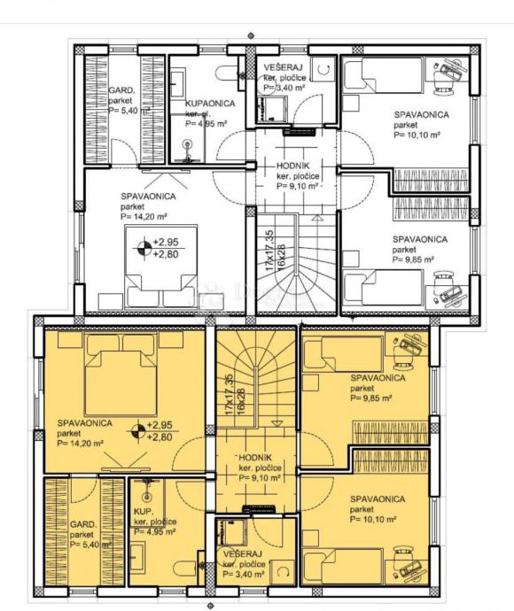 Druga etaža: hodnik, tri prostrane spavaće sobe, garderoba, kupaonica, vešeraj