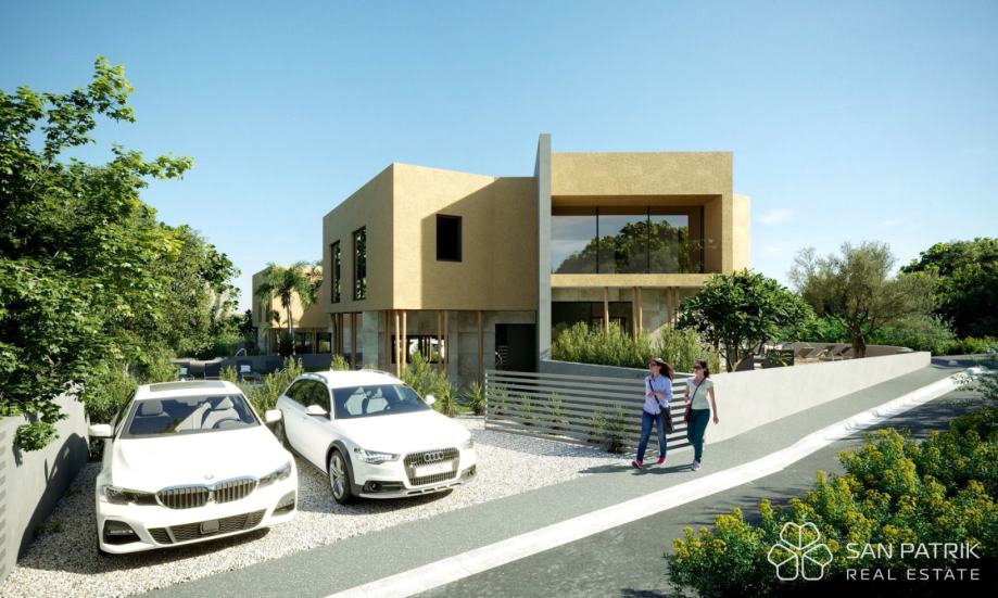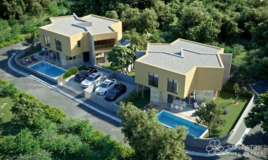 Vila 1 - ukupna površina 116 m2 (3 spavaće sobe + 2 kupaonice + WC + kuhinja/blagovaonica/boravak) + terasa 1(13,5 m2) + terasa 2 (7,6 m2) + vanjski bazen + 2 parkirna mjesta = 445.000 EUR (cijena jedne polovice kuće)