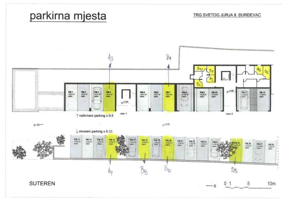 Uz svaki stan obvezna je po vlastitom izboru kupnja garažnog - koef. 0.5 ili vanjskog parkirnog mjesta - koef 0.25 (priložen tlocrt/raspored i kvadratura parkirnih mjesta)