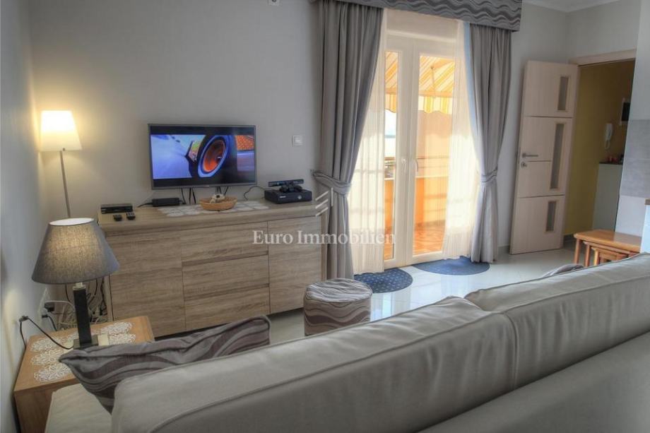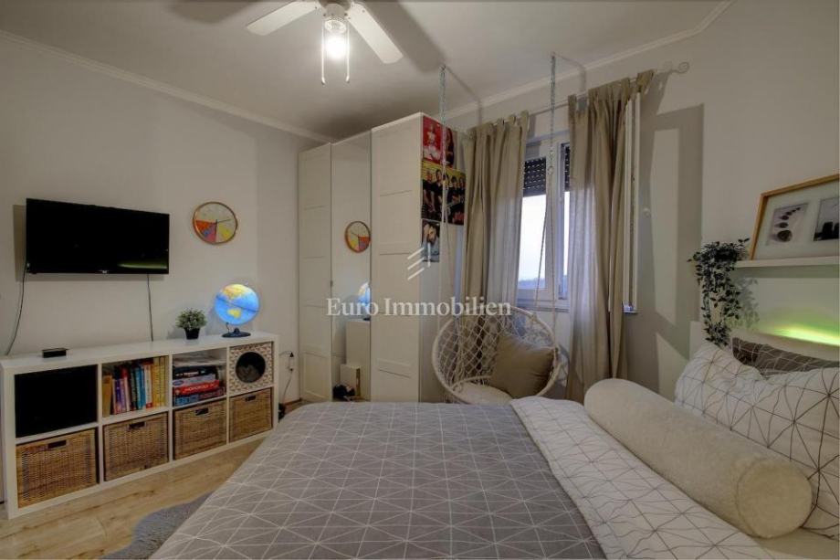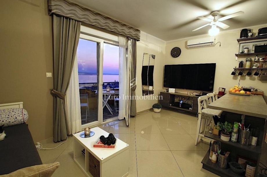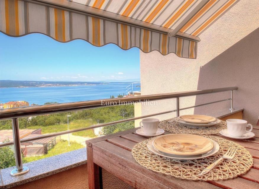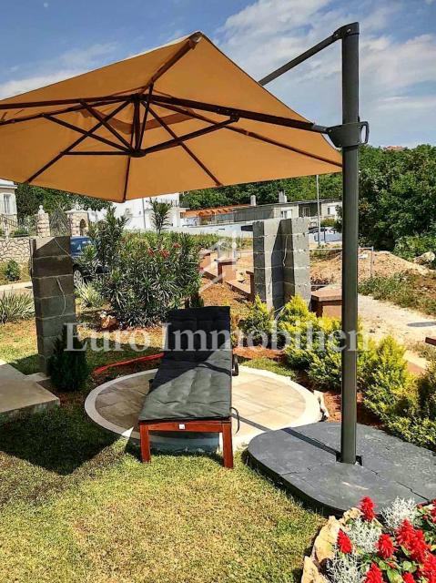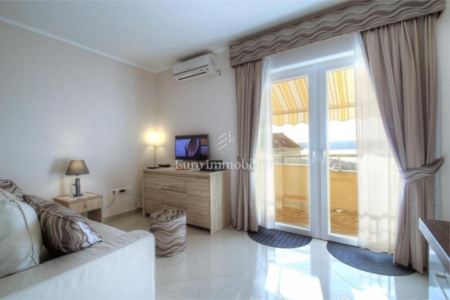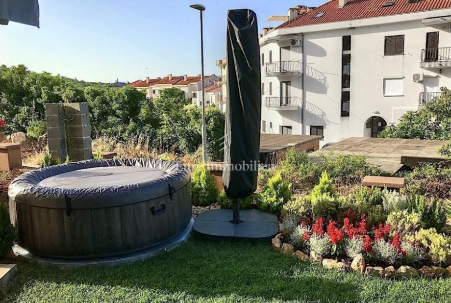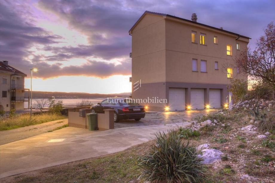 Stan ukupne površine 120 m2 se sastoji od tri spavaće sobe, dva dnevna boravka, dvije kuhinje, dvije kupaonice i tri balkona s prekrasnim pogledom na zaljev i otok Krk. Stanu pripada tavan koji se dodatno može urediti u stambeni prostor u potkrovlju, te 70 m2 okućnice. Dvorište je u završnoj fazi i sastoji se od zidanog mjesta za roštilj sa šankom, popločenog mjesta za sjedenje u sjeni pergole i mjesta za jacuzzi, te zelenog raslinja. Stanu pripada garaža i jedno parkirno mjesto ispred garaže. U naravi se sastoji od dva stana na zadnjoj etaži; od kojih se jedan vrlo uspješno iznajmljuje turistima i kategoriziran je s 4 zvjezdice, te predstavlja odličan potencijal za investiciju. Nalazi se na odličnoj, mirnoj lokaciji svega desetak minuta hoda do plaža i šetnice uz more. Idealno za veću obitelj ili osobe sa željom za dodatnu zaradu!