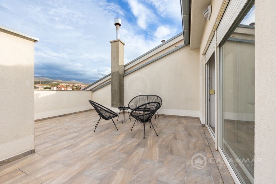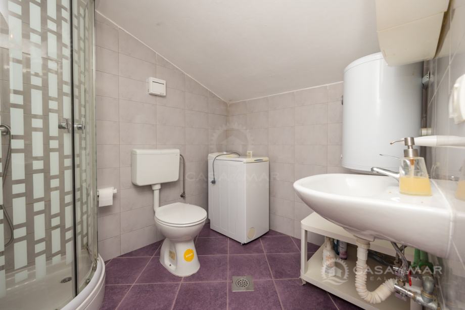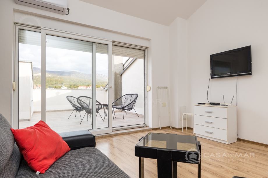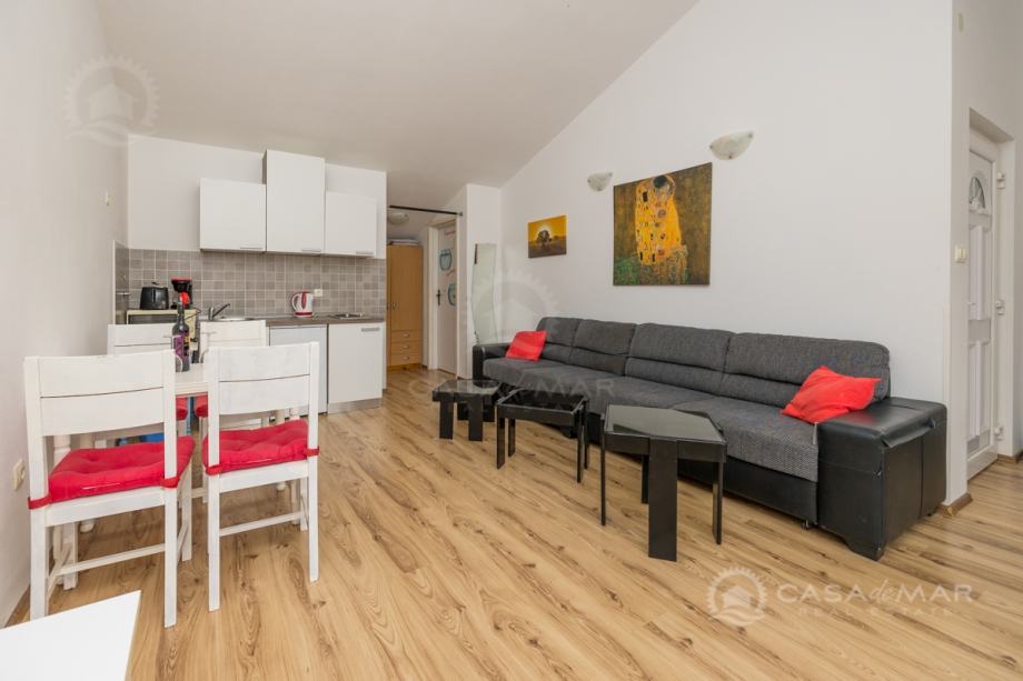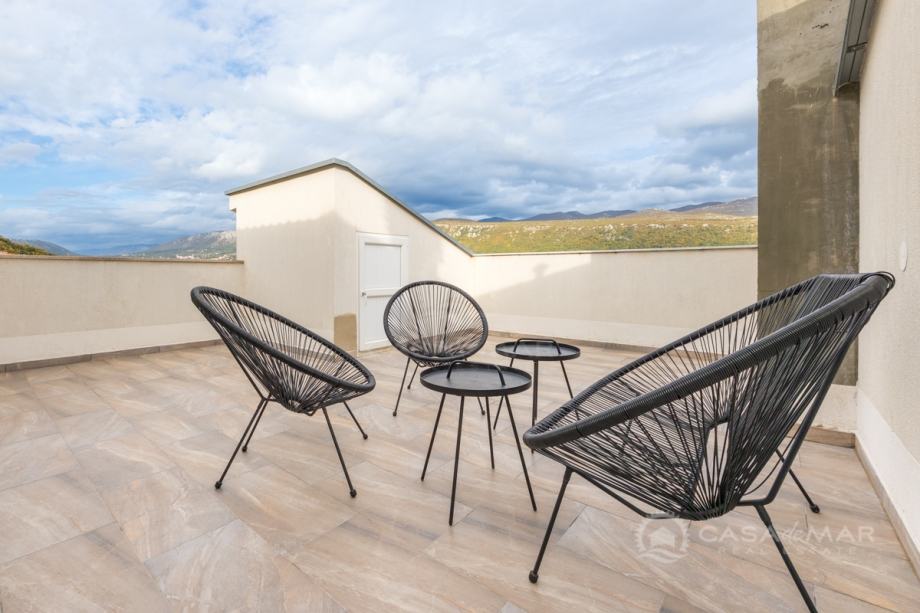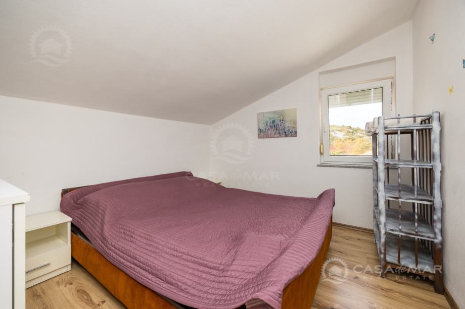 Stan u potkrovlju se sastoji od dnevnog boravka, kuhinje, kupaonice, ostave, jedne spavaće sobe te krovna terasa sa koje se pruža pogled na more.