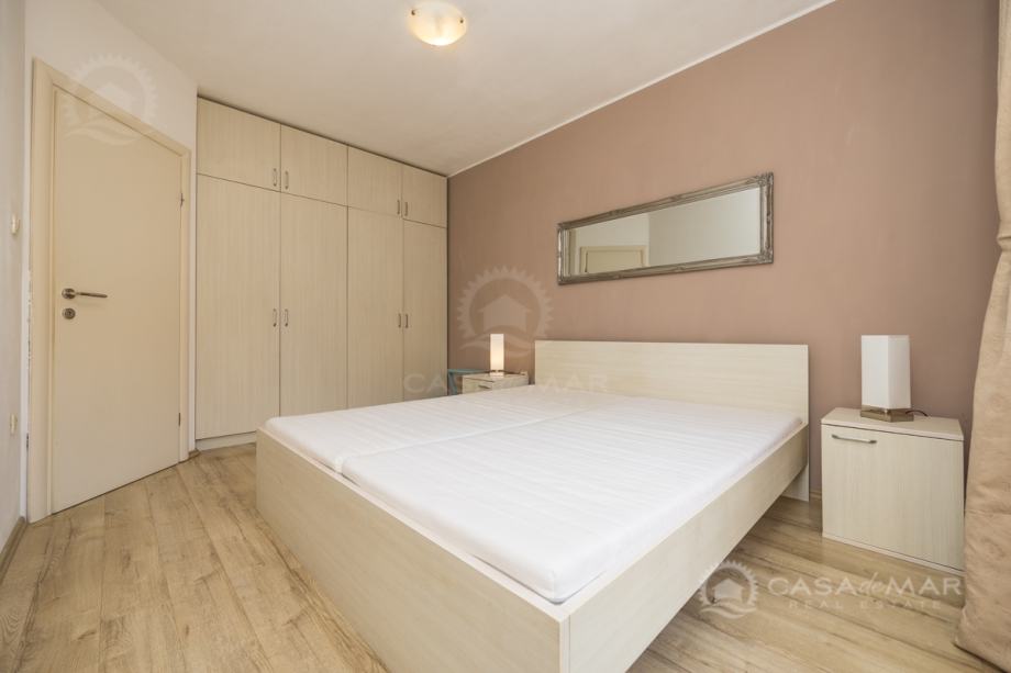 Nekretnina se sastoji od ulaznog hodnika, dnevnog boravka koji ima izlaz na balkon sa kojeg se pruža pogled na more, kuhinje sa blagovaonicom, dvije spavaće sobe, jedna kupaonica i jedan toalet. Spavaće sobe imaju izlaz na zajednički balkon.