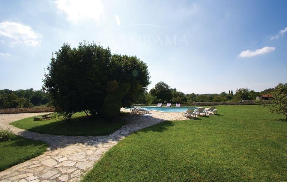 Parcela je u cijelosti ograđena, većim dijelom zazelenjena, manjim popločana i ima automatsko navodnjavanje. Centralno mjesto je bazen sa slanom vodom površine 50m2, atipičnog oblika i s posebnom oblogom od novozelandskog tirkiznog kamena i kompletno automatiziranog.