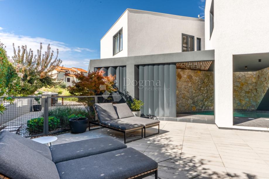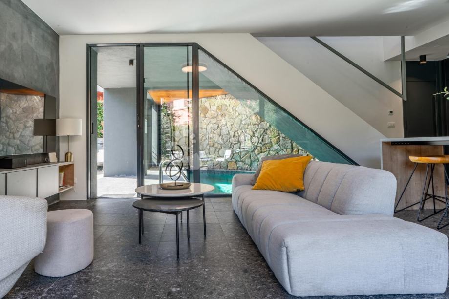 Impresivne staklene stijene protežu se duž cijelog prizemlja i u potpunosti se otvaraju, stvarajući dojam da ste istovremeno u kući i na terasi – okruženi mirisima mediteranskog vrta i pogledom na bazen.