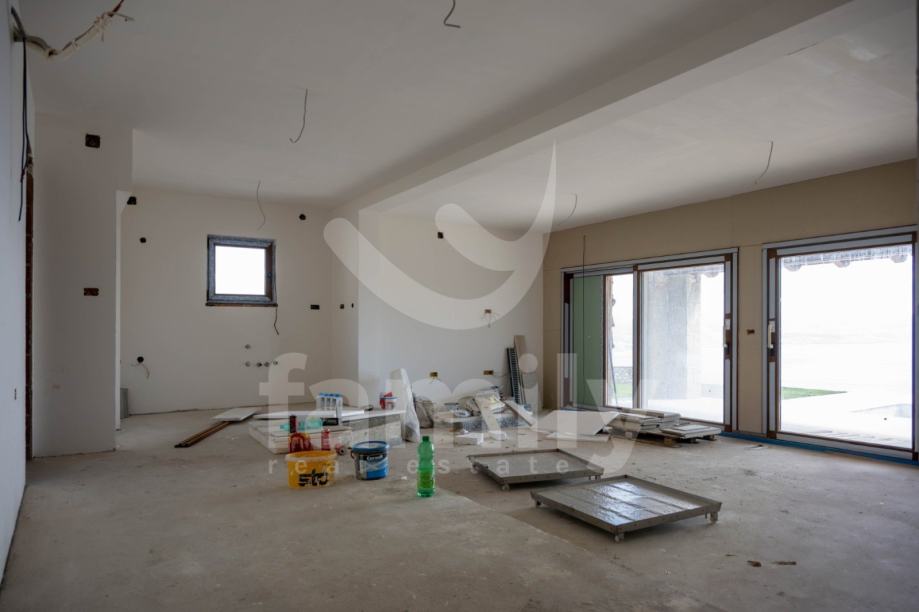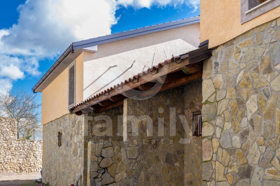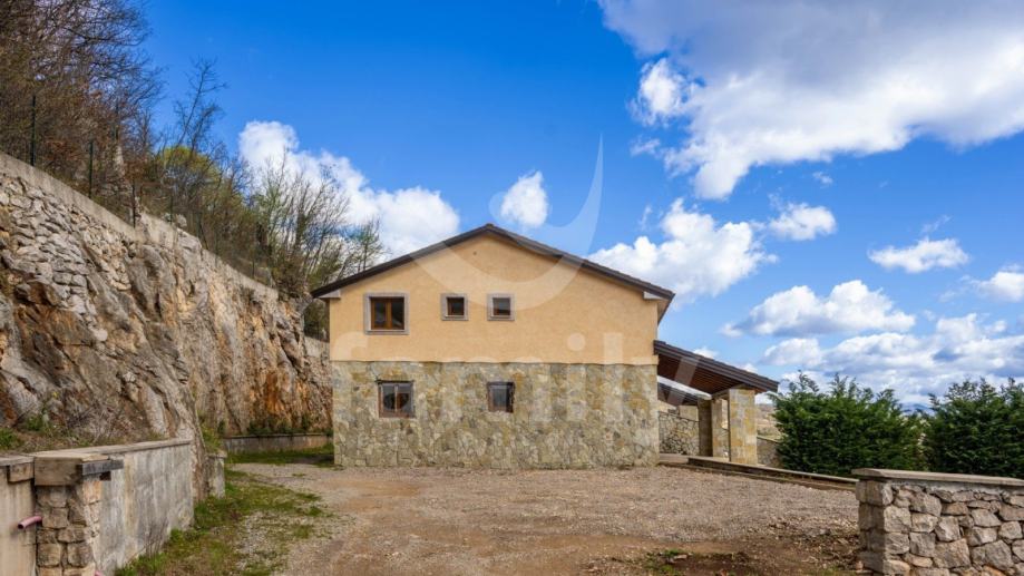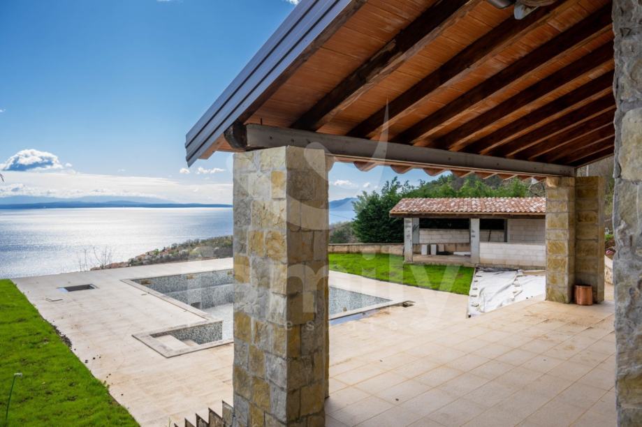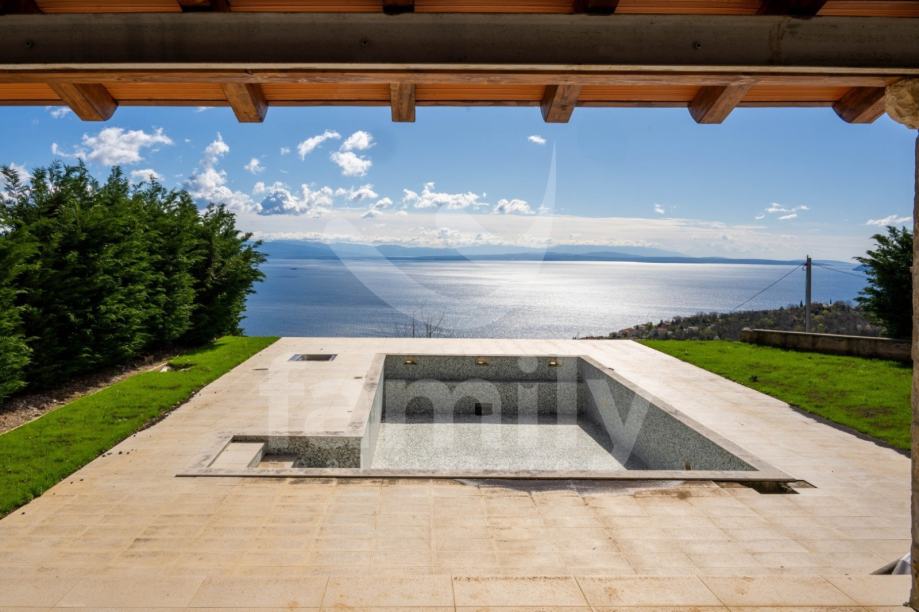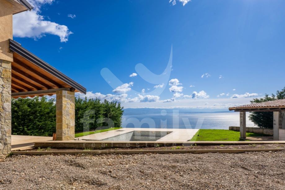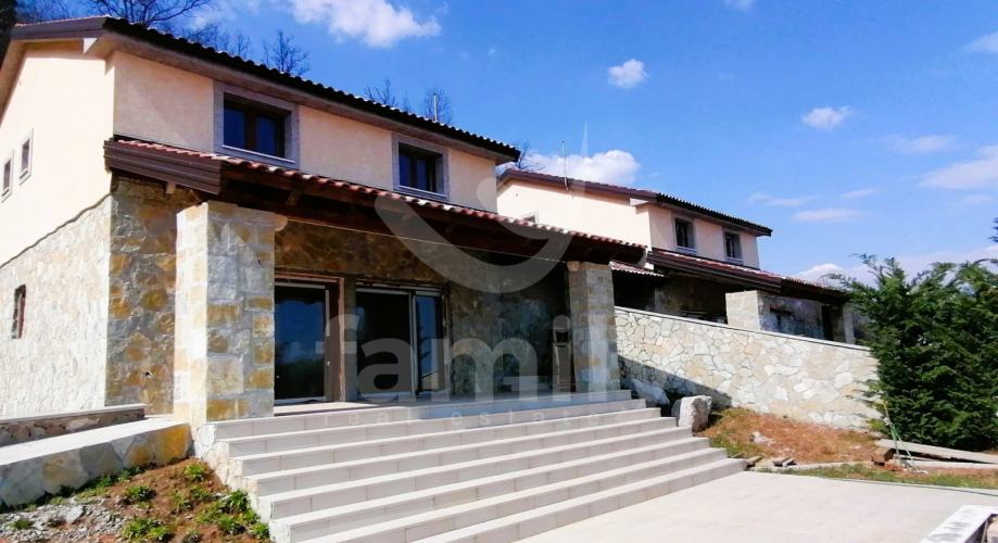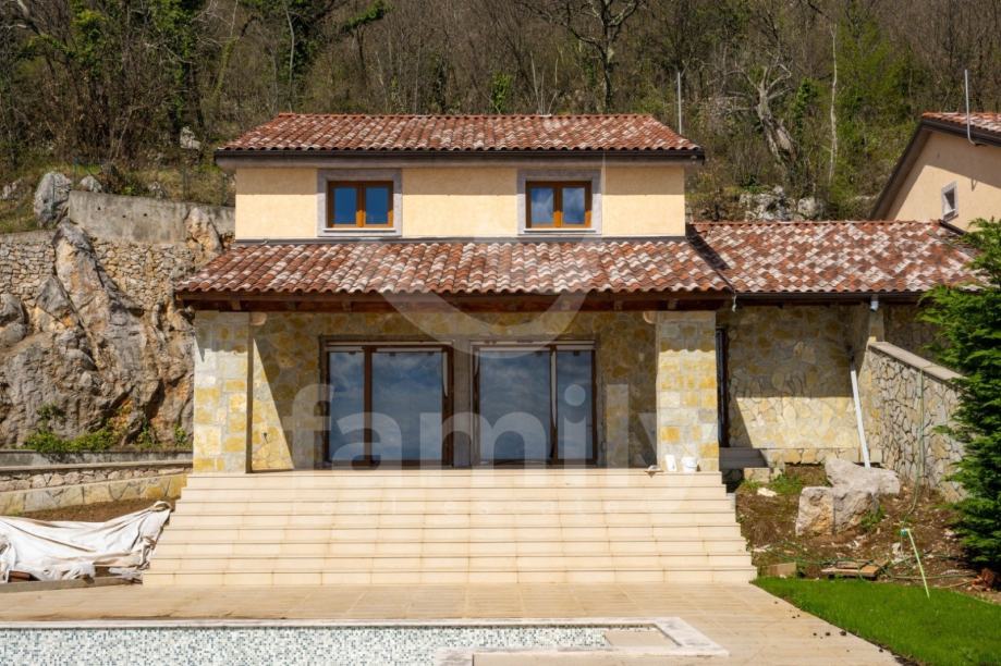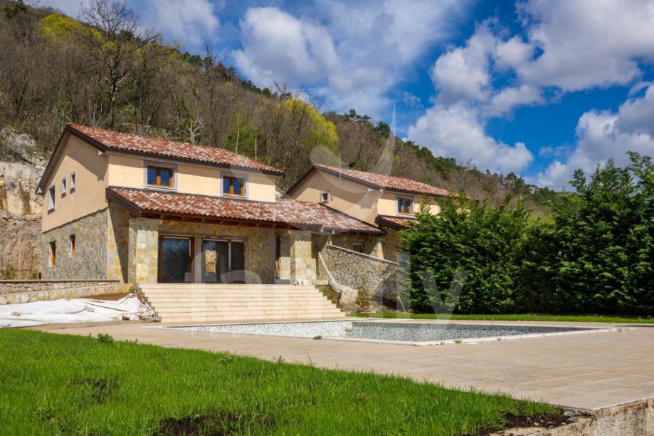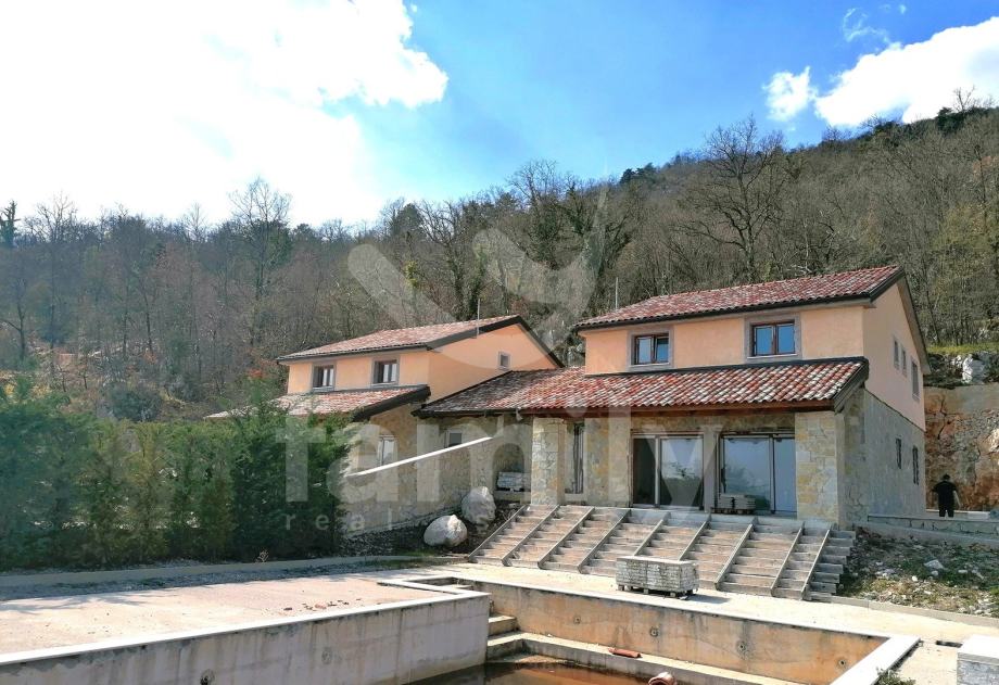 Upravo nedaleko od Opatije u mjestu Poljane, iznad Ičića, nalaze se ove dvije prekrasne kuće koje su identične, a koje krasi fantastičan, otvoreni pogled na more, Kvarnerski zaljev, Cres i Krk. Svaka kuća je površine 200 m2 i prostire se na dvije etaže. Prizemlje svake kuće projektirano je tako da je omogućeno korištenje osobama sa poteškoćama te su se na toj etaži smjestili prostrani dnevni boravak, kuhinja, blagovaonica, spavaća soba sa kupaonicom, prostor za vešeraj, sauna i toalet. Na prvome katu nalaze se tri spavaće sobe, svaka sa svojom kupaonicom - u svakoj kupaonici postavljeno je podno grijanje na električnu energiju i keramika. Objekti su u visokoj roh bau fazi, zidovi su pogletani, a na njima je postavljena i demit fasada debljine 12 cm, dok je prizemni dio u kamenu. Okućnice objekata podrazumijevaju bazene površine 62 m2, rampe za osobe sa poteškoćama, ljetnju kuhinju površine 32 m2. Svaka prostorija opremljena je inverter klima uređajem. Sve instalacije su provedene, dok se budućim vlasnicima ostavlja mogućnost odabira keramike, laminata ili parketa te završetak, a postavljena je PVC stolarija troslojnog stakla sa 6 plinskih komora. Mogućnost kupnje jedne od dvije kuće.