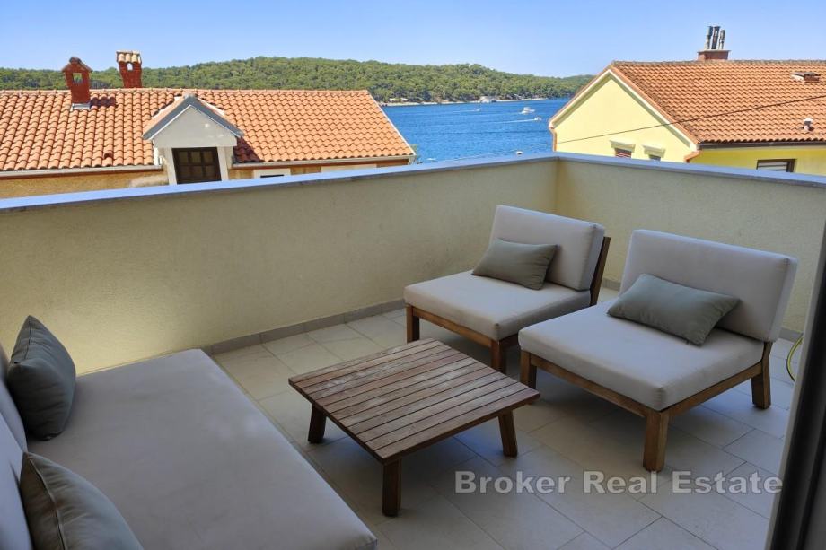 U Malom Lošinju prodaje se dvoetažni stan s pogledom na more, ukupne 97 m² neto korisne površine. Stan se prostire na prvom i drugom katu zgrade te je pogodan za svakodnevno stanovanje ili korištenje za odmor.