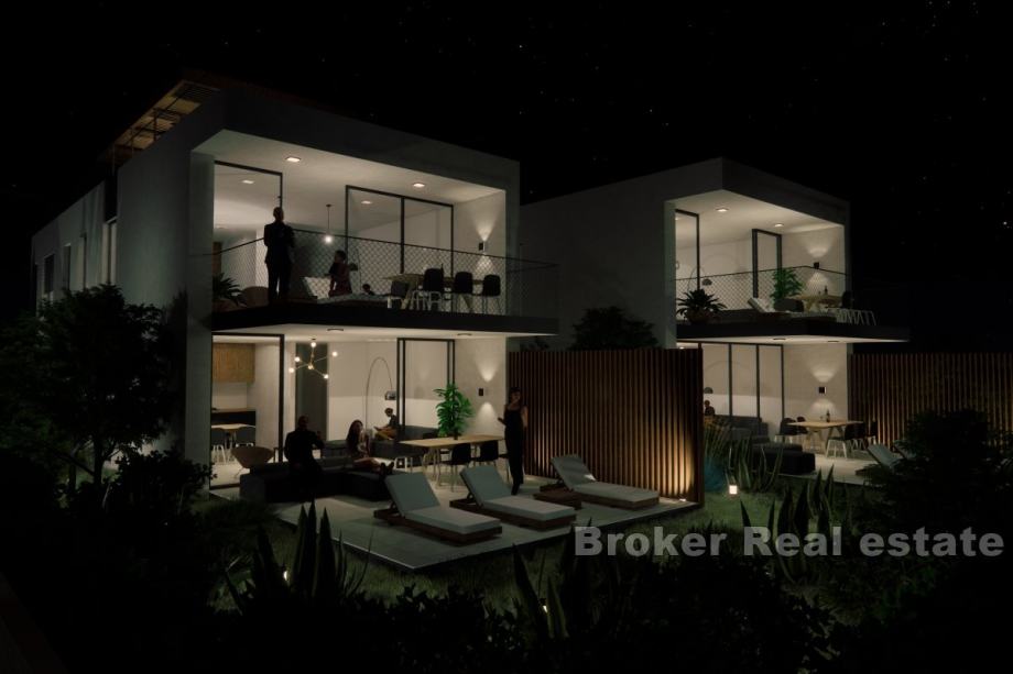 Stan uključuje tri spavaće sobe, svaka s vlastitom kupaonicom, prostranu kuhinju s blagovaonicom te dnevnu sobu, kao i zajednički toalet. Privatno stubište vodi do ekskluzivne krovne terase s pogledom na more. Cijena uključuje vlastito parkirno mjesto i spremište.