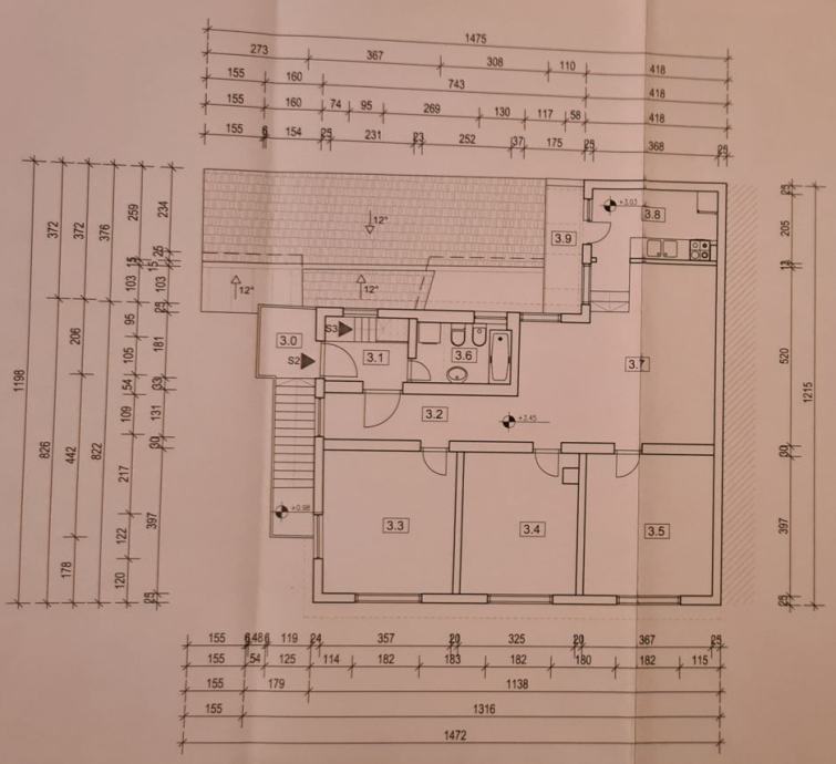 I kat - stubište, hodnik sa stepenicama, kupaonica, hodnik, tri spavaće sobe, dnevni boravak s blagovaonicom, kuhinja i balkon.