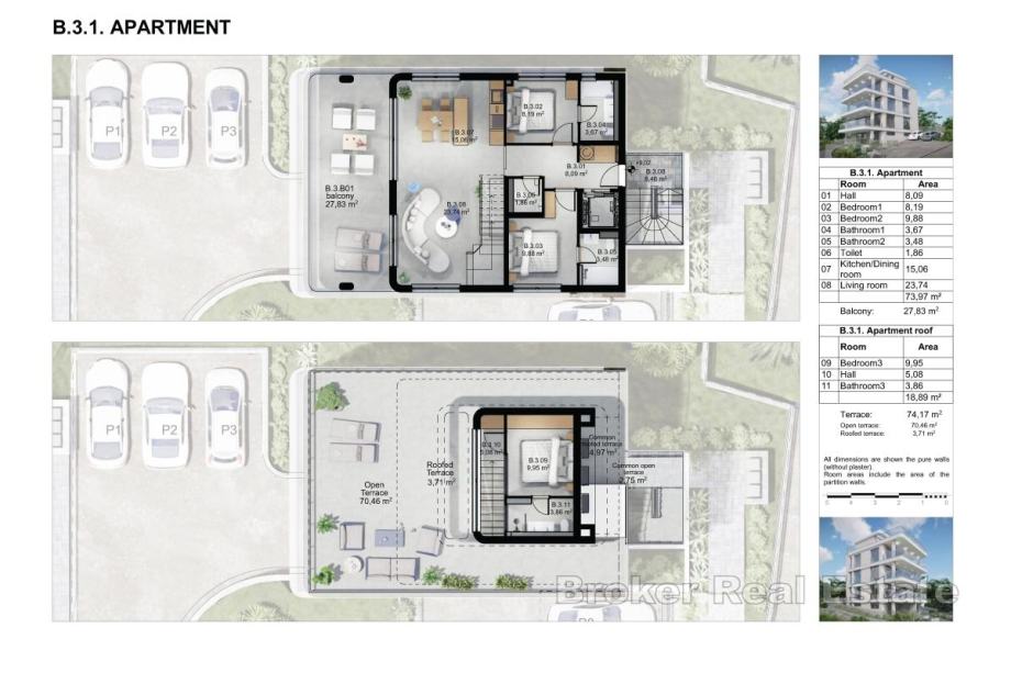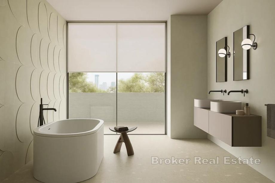Stan se nalazi na trećem katu manje, moderno građene stambene zgrade opremljene dizalom, a zahvaljujući orijentaciji na istok, jug i zapad, obiluje prirodnim svjetlom tijekom cijelog dana. Ukupna stambena površina iznosi 92,86 m², a prostor je funkcionalno i elegantno raspoređen. Prva etaža se sastoji od dvije udobne spavaće sobe, dvije kupaonice, toaleta, hodnika te otvorenog koncepta kuhinje, blagovaonice i dnevnog boravka iz kojega se izlazi na prostrani balkon površine 27,83 m² koji pruža idealan prostor za opuštanje i druženje. Na drugoj etaži se nalazi master spavaća soba s kupaonicom i hodnik te natkrivena i nenatkrivena krovna terasa površine 74,17 m² s koje se pruža panoramski pogled na more, a koja se može opremiti po želji kupca.