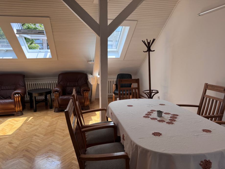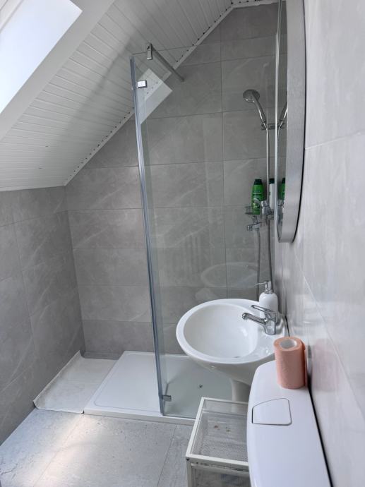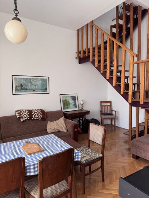 Prodajemo renovirani 2-etažni stan u centru grada (blizina tržnice i promenade), sastoji se od kuhinje 7,50 m2, dnevnog boravka 18,67 m2, sobe 21,45 m2, kupaonice 2,14 m2, predprostora 3,14 m2, ukupne površine 53,16 m2 u prizemlju te 3 sobe, kupaonicom i kuhinjom u potkrovlju površine 77 m2. Stanu pripada dva podruma od ukupno 30 m2. Grijanje je centralno na toplanu (podstanica u podrumu).
