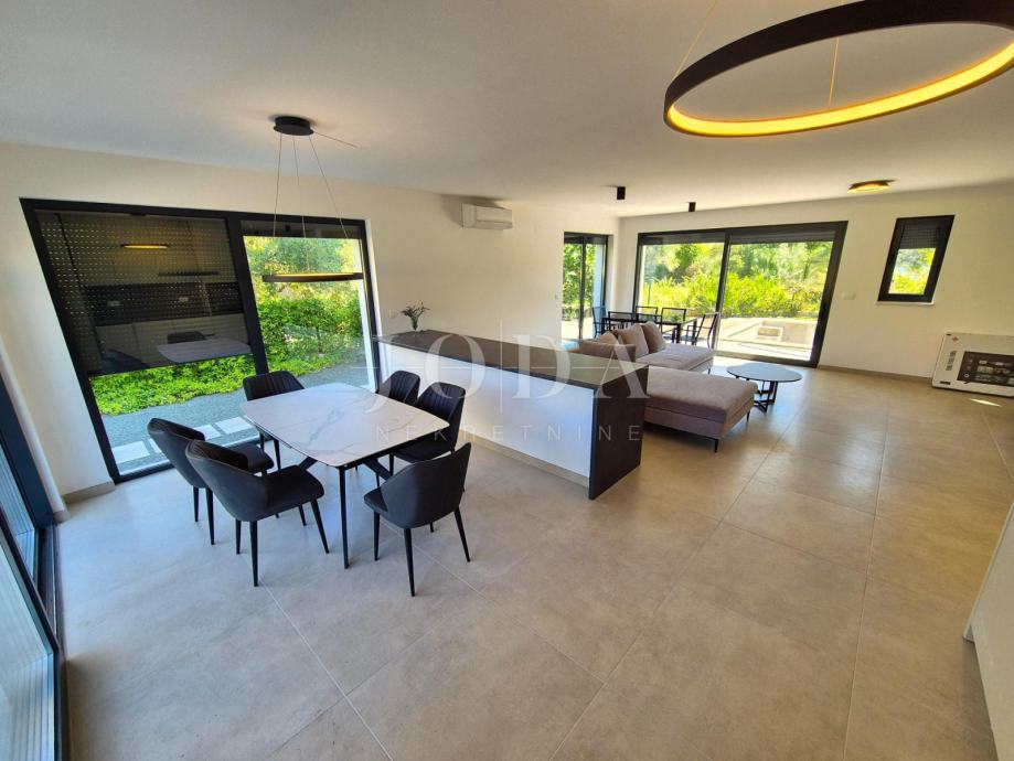 Iz dnevnog boravka izlazi se na terasu i okućnicu s bazenom.