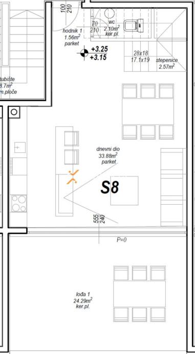 In addition, the apartment has a parking space in front of the building. The total net area of the apartment with all additional parts is 131,06 m2.