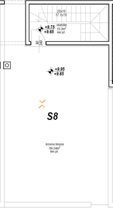 Raspored prostorija na 1. katu čine hodnik, WC, kuhinja s blagovaonicom i dnevnim boravkom te lođa. Unutarnje stepenice vode na drugi kat gdje se nalaze hodnik, dvije spavaće sobe s kupaonicom, praonica i lođa. Unutarnje stepenice vode dalje na krovnu terasu površine 59,24 m2. Neto korisna površina opisanih prostorija iznosi 127,49 m2.