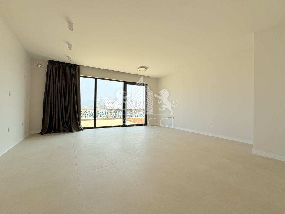 Sastoji od ulaznog dijela / hodnika, kupaonice i prostranog dnevnog boravka s kuhinjom i blagovaonicom s izlazom na nenatkrivenu terasu u prizemlju. Posebno ističemo kroz cijeli dnevni dio postavljene klizno-podizne stijene koje pružaju pogled na more. Na katu su dvije spavaće sobe od koji jedna ima vlastitu en-suite kupaonicu. Iz spavaćih soba se također pruža pogled na more i Velebit.