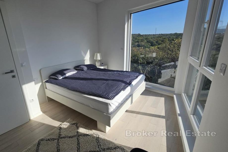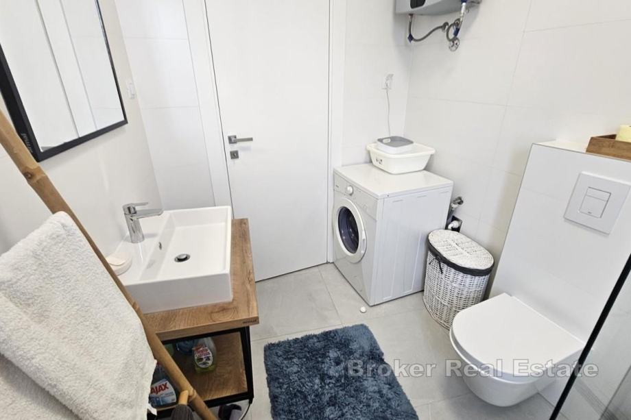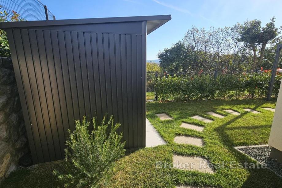 Apartmanu pripada ozelenjena okućnica od 124 m² s automatskim navodnjavanjem, ljetnom kuhinjom s tendom i vrtnom kućicom. Opremljen je PVC vanjskom stolarijom, protuprovalnim vratima, multi-split klimatizacijom te infracrvenim grijaćim pločama u sobama.