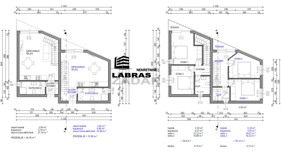 Prvi kat (potkrovlje) sadrži stubište, hodnik, dvije spavaće sobe, kupaonicu s WC-om i terasu bruto površine 2,15 m2.