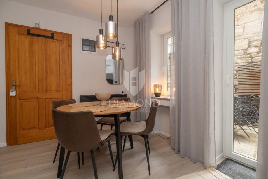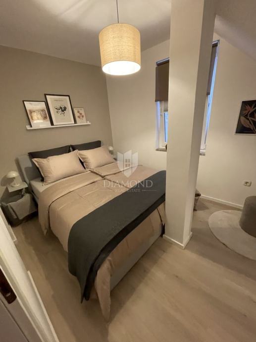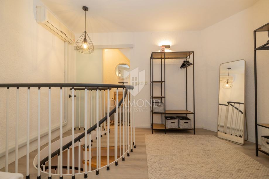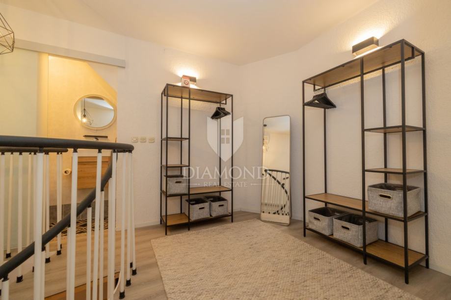 Riječ je o potpuno renoviranom dvoetažnom stanu smještenom na prvom i drugom katu, ukupne površine 60 m². Interijer stana osmišljen je s posebnom pažnjom na funkcionalnost i estetiku. U prizemnoj etaži nalazi se prostran i svijetao dnevni boravak povezan s modernom i potpuno opremljenom kuhinjom i blagovaonicom, kupaonica s tušem te prva spavaća soba s bračnim krevetom. Posebnu vrijednost ovom stanu daje izlaz iz dnevnog dijela na terasu u vlasništvu grada, čiji pristup ima isključivo ovaj stan. Idealno mjesto za jutarnju kavu ili opuštanje nakon dana provedenog u gradu. Zbog svoje orijentacije, na terasi je moguće boraviti u bilo koje doba dana, u miru i tišini.
