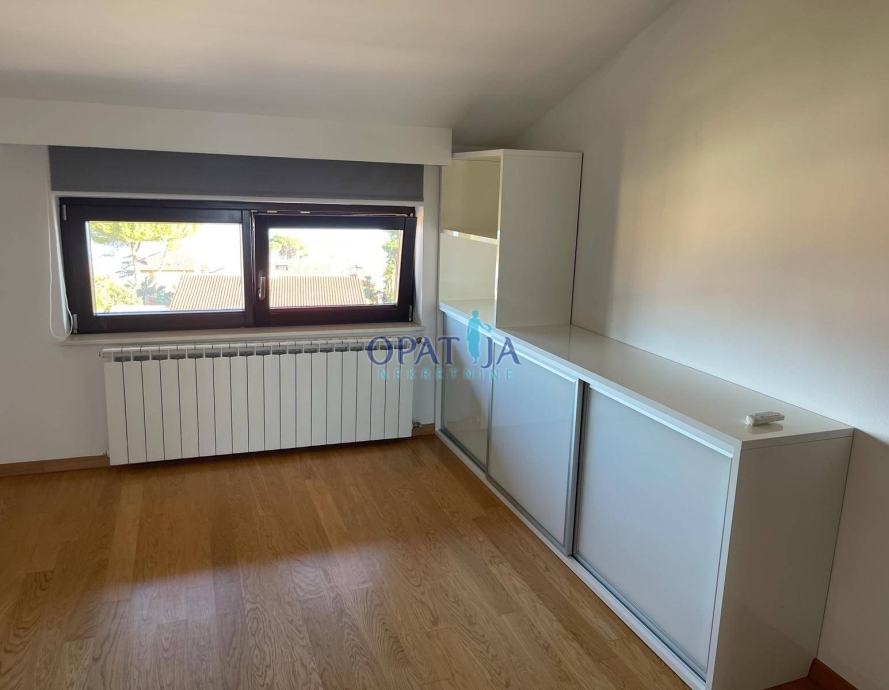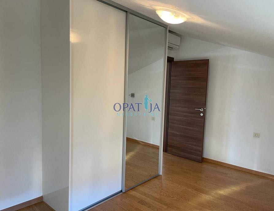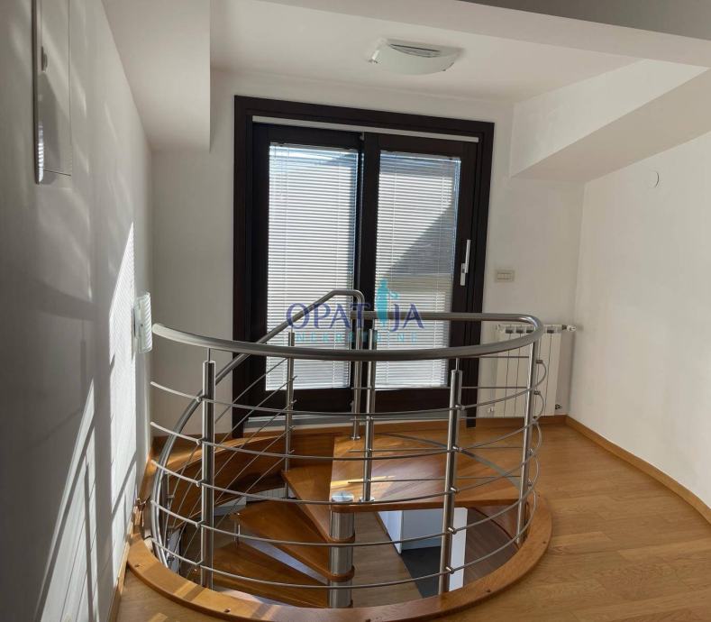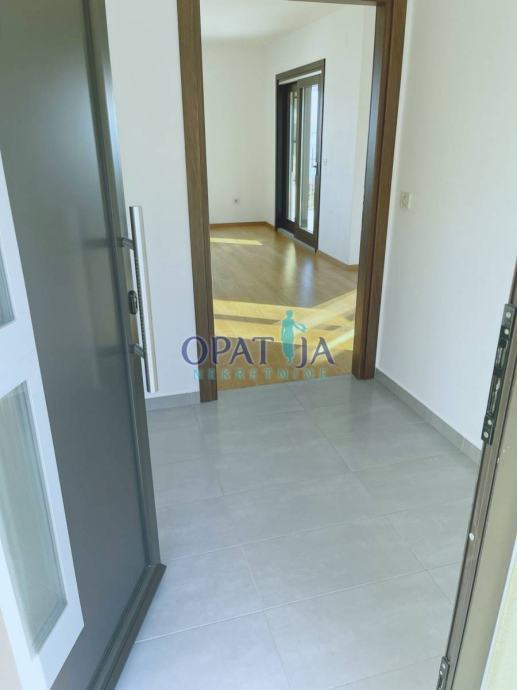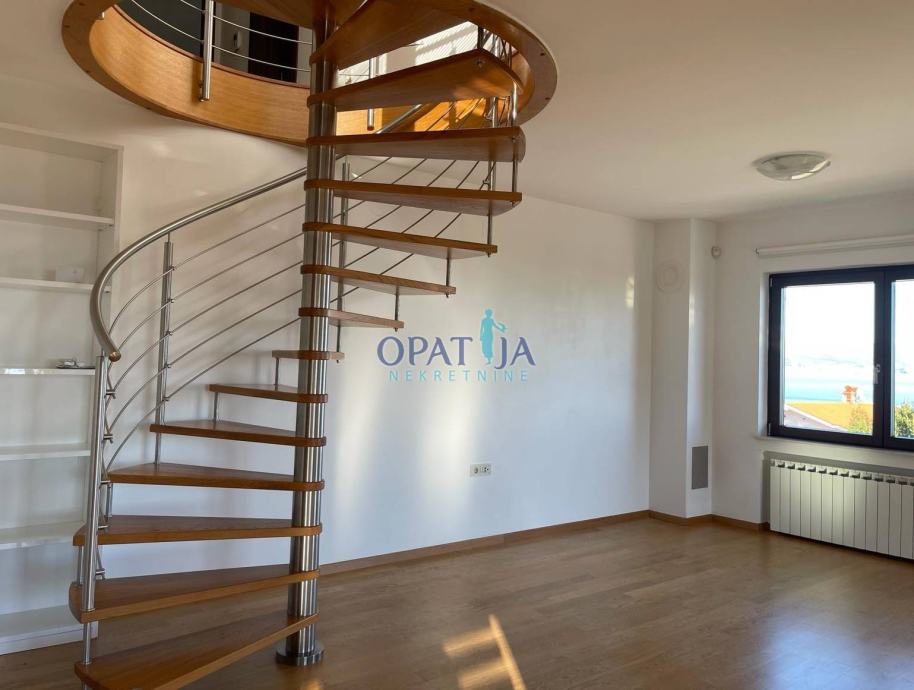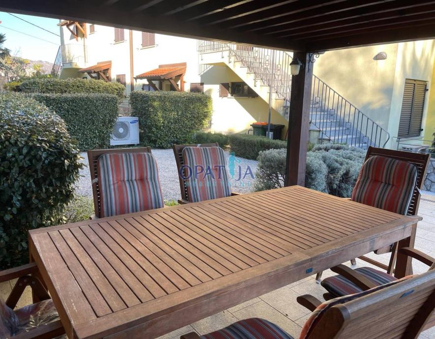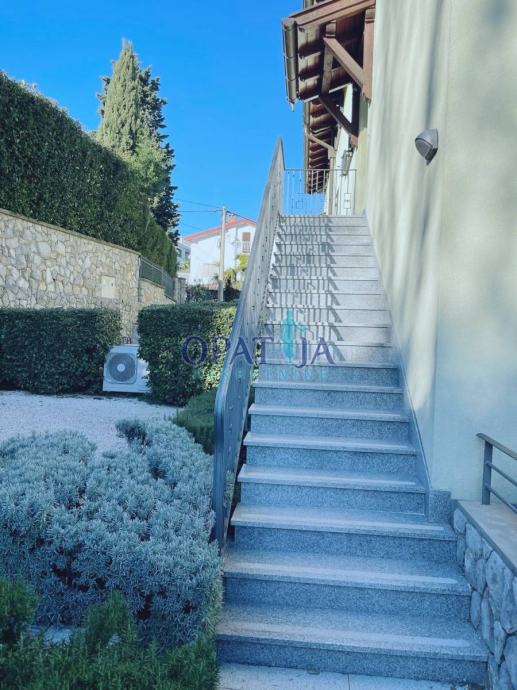 Podzemna garaža je samo od navedenog stana i posjeduje vodu, a pored garaže je još jedno parkirno mjesto; dalje stepenice vode u prekrasan vrtni dio i ulaz u stan, a koji se sastoji od ulaza, kupaonicom sa WC-om, kuhinje, prostranog dnevnog boravka (mogućnost postavljanja kamina) s blagovaonicom i velike terase - na prvom katu građevine, površine 48,32 m2, hodnika, kupaonice sa WC-om, tri spavaonice i terase, na drugom katu, površine 63,57 m2, ukupne površine 112 m2. Sveukupna površina sa garažnim prostorom je 128 m2 i još plus vrtni prostor 59 m2. Stan ima sva obilježja kuće u nizu sa vrtom i garažom, te pogledom na Kvarnerski zaljev sve do Cresa i " velih vrata ".
