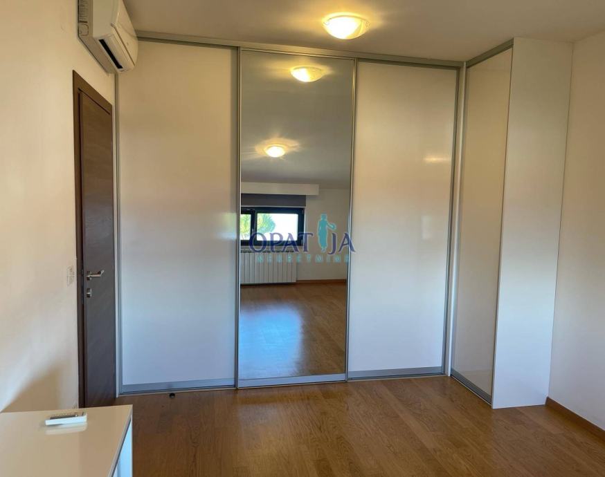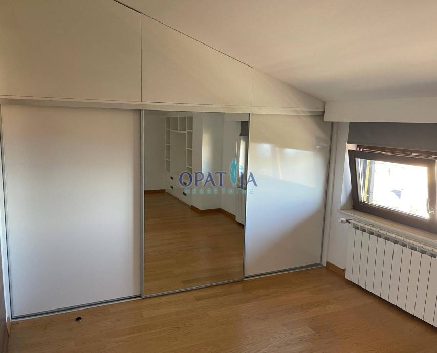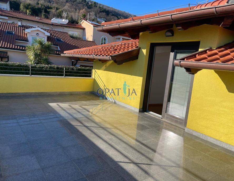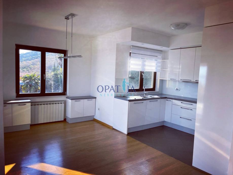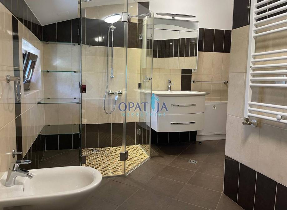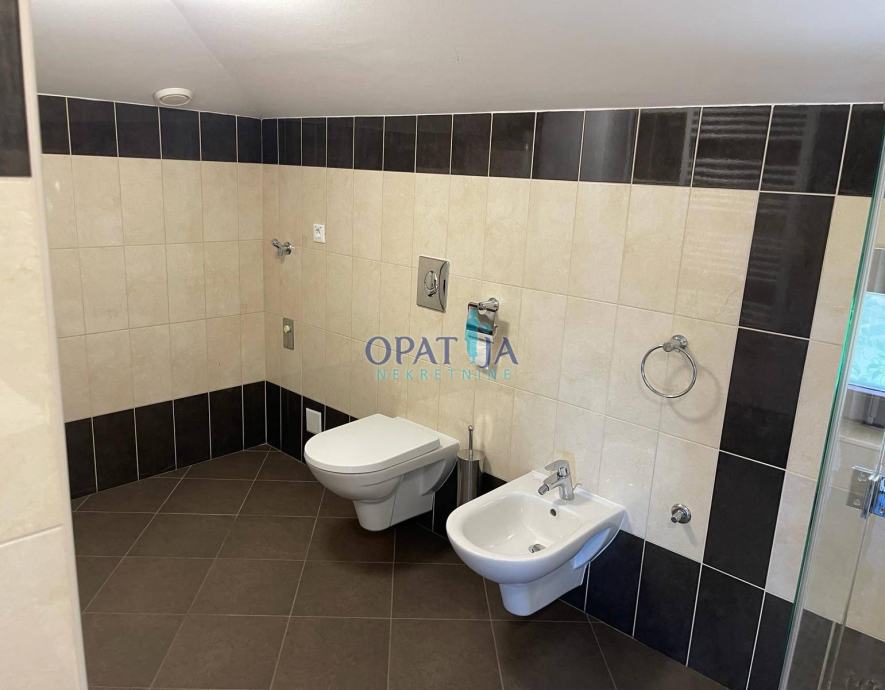 Podzemna garaža je samo od navedenog stana i posjeduje vodu, a pored garaže je još jedno parkirno mjesto; dalje stepenice vode u prekrasan vrtni dio i ulaz u stan, a koji se sastoji od ulaza, kupaonicom sa WC-om, kuhinje, prostranog dnevnog boravka (mogućnost postavljanja kamina) s blagovaonicom i velike terase - na prvom katu građevine, površine 48,32 m2, hodnika, kupaonice sa WC-om, tri spavaonice i terase, na drugom katu, površine 63,57 m2, ukupne površine 112 m2. Sveukupna površina sa garažnim prostorom je 128 m2 i još plus vrtni prostor 59 m2. Stan ima sva obilježja kuće u nizu sa vrtom i garažom, te pogledom na Kvarnerski zaljev sve do Cresa i " velih vrata ".