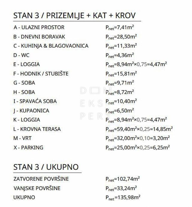 Grijana stambena površina iznosi 102.74 m², a sa svim pripatcima (vrt, krovna terasa, lođa i dva parkirna mjesta) obračunatim po koeficijentima, ukupna površina iznosi 135.98 m².