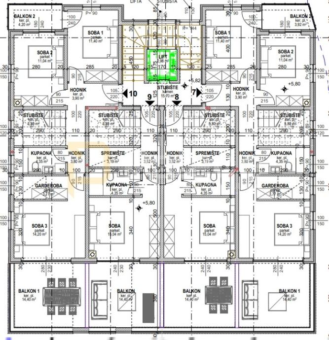 Fasada zgrade će biti u kombinaciji toplinske izolacije mineralne vune (12 cm) i DEMIT završnog sloja, što će pridonijeti energetskoj učinkovitosti (razred A). Pregradni unutarnji zidovi su od opeke debljine 10 cm, a PVC stolarija će imati Low-E dvostruka izo-stakla s komarnicima i električnim roletnim sustavom. Grijanje i hlađenje će biti putem Multi Split inverterskog sustava. Zgrada će biti opremljena hidroizolacijom, toplinskom izolacijom te izolacijom od buke, a imat će i lift.