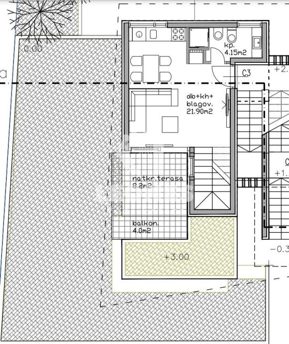Ovaj se dvoetažni stan od 61,20m2 neto korisne površine proteže na dva kata (prvi i drugi) te se na prvom katu nalazi prostran dnevni boravak s kuhinjom i blagovaonicom s izlazom na natkrivenu terasu i balkon.