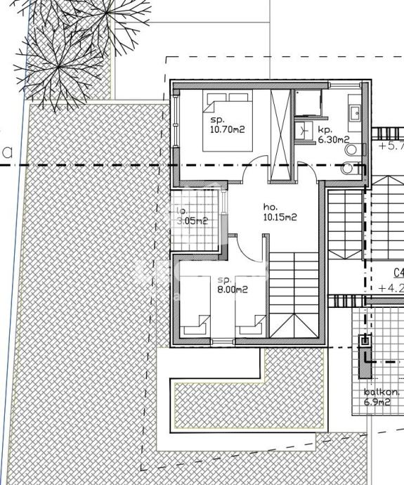 Na drugom se katu nalaze dvije spavaće sobe s kupatilom i zajednička lođa.