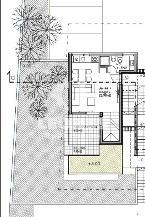 Na prvom se katu nalazi prizemni dio stana koji uključuje dnevni boravak, kuhinju s blagovaonicom kupatilo i natkrivenu terasu kao i balkon.