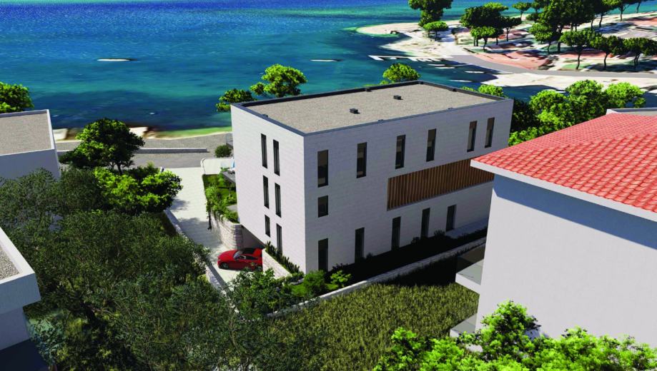 Na predivnoj lokaciji samo 20m od mora prodaje se moderan dvoetažan stan ukupne površine od 142,59 m² s jedinstvenim pogledom na more i šibenski arhipelag.Stan je smješten na prvom drugom katu te se sastoji od ulaznog prostora, kuhinje s blagovaonicom i dnevnim boravkom, WC i garderobe te dva nenetkrivena balkona s kojih se pruža pogled na more. Druga etaža stana, do koje se dolazi unutranjim stubištem, sastoji se od hodnika, tri spavaće sobe od kojih je jedna master soba s kupaonicom i garderobom, druge kupaonice i jednog balkona.Sve prostorije su opremljene klima uređajima Mitsubishi (split sustav) i podnim grijanjem (Magnum).