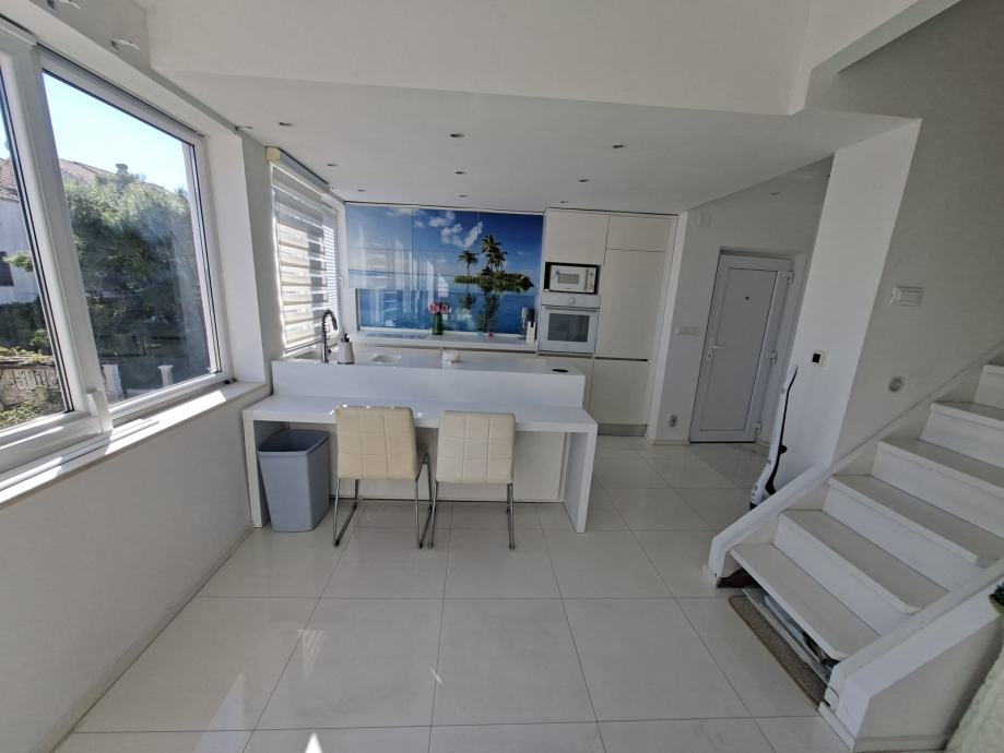 Smješten je na drugom katu i potkrovlju stambene zgrade. Na prvoj etaži su kuhinja, dnevni boravak i blagovaonica u jednom, kupaonica, a na drugoj dvije spavaće sobe od kojih jedna ima izlaz na balkon sa pogledom na more. Kompletno je namješten i opremljen, sa podnim grijanjem i klima uređajem te je spreman za useljenje.