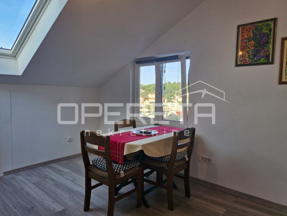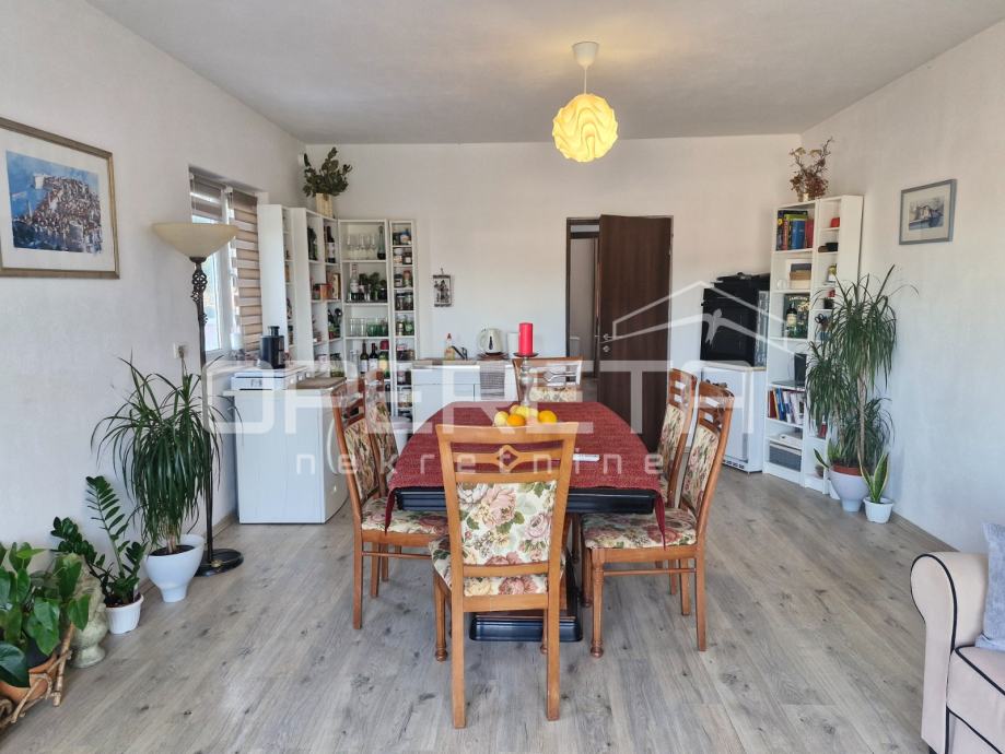 Stambeni prostor ima približno 127 m² i raspoređen je na dvije etaže s galerijom, dok se uz nekretninu nalaze vrt i dvorište površine oko 90 m², kao i parkirno mjesto ispred objekta. Orijentacija prema sunčanoj strani omogućuje obilje prirodnog svjetla, a balkon pruža lijep otvoreni pogled na more.