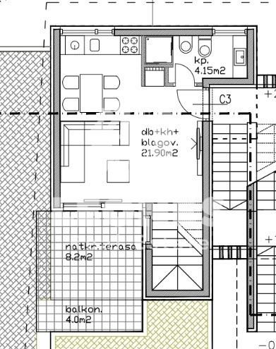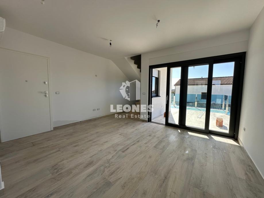 Ovaj kvalitetan stan sastoji se od dvije etaže. Na prvoj se etaži nalazi open space dnevni boravak s kuhinjom i blagovaonicom kao i kupatilo te velika terasa i balkon.