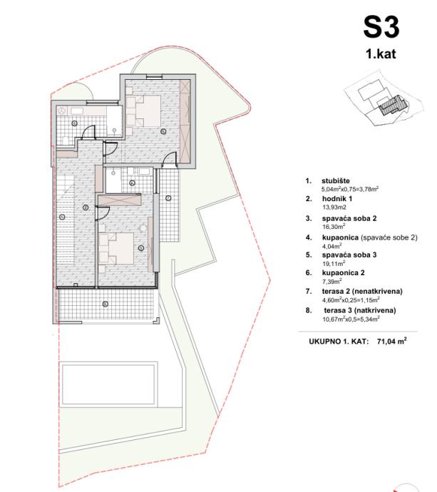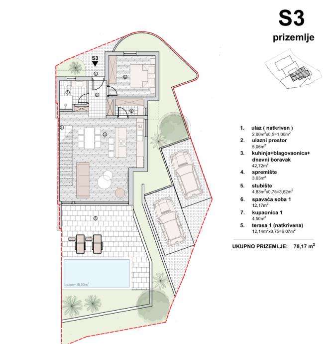 Stan S3, ukupne veličine 204 m2, od čega je 172 m2 neto stambenog prostora, dio je novogradnje tripleks kompleksa, smješteni na uzvišenom području sa spektakularnim pogledom. Sastoji se od dvije etaže, veličine 78 i 71 m2, povezane unutrašnjim stubištem. U prizemlju stana nalaze se open space koncept kuhinje sa blagovaonicom i dnevnim boravkom, veličine 43 m2, prostrana spavaća soba i kupaonica.