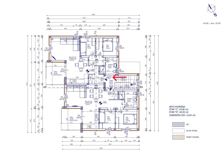 - dvije spavaće sobe (9,25 m2 i 6,42 m2)