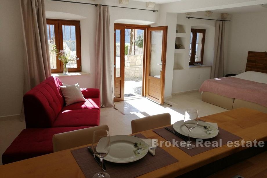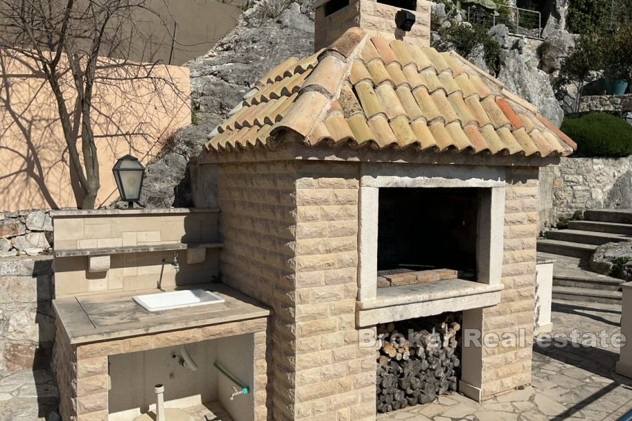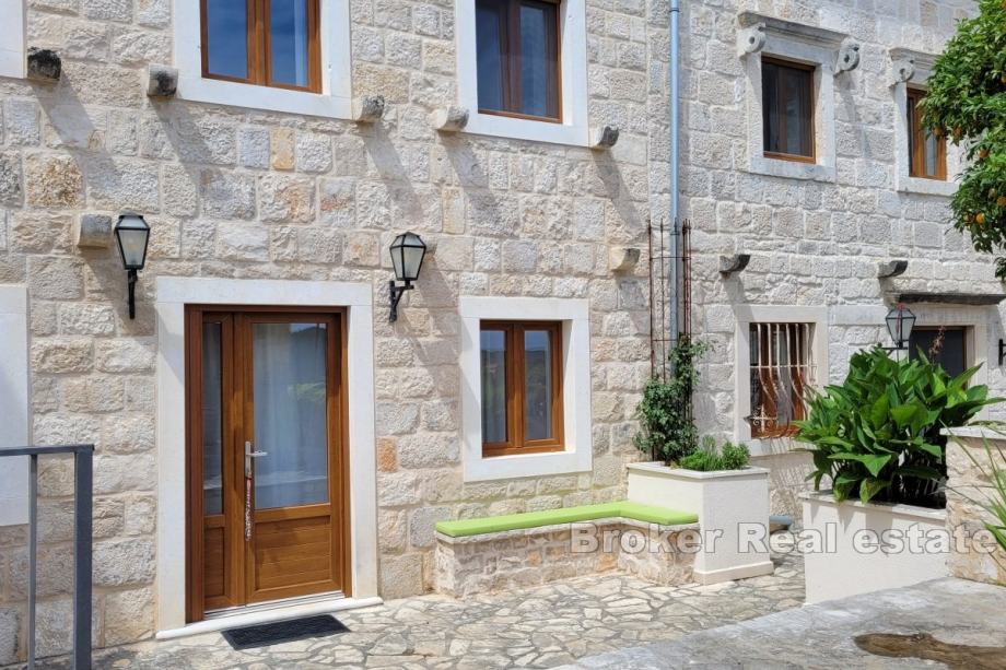 Interijer je uređivan u mediteranskom stilu, koristeći izvorni kamen što daje posebnu autentičnost pro-storu. Kuća je kompletno opremljena, a sadrži i dodatne prostorije poput ostave i praonice.
