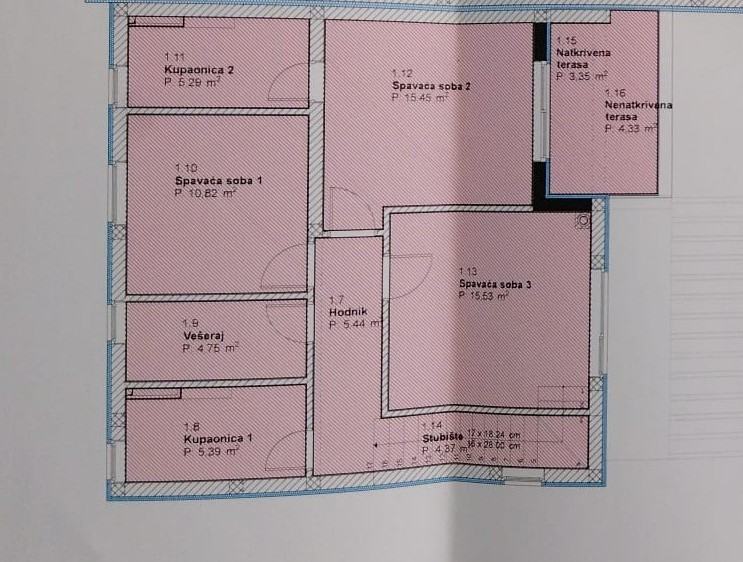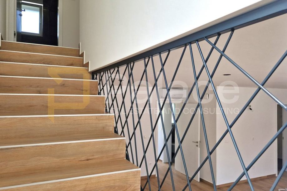 Kuća se prostire na dvije etaže, u prizemlju je natkriveni ulaz, hodnik, wc, prostrani dnevni dio s kuhinjom i blagovaonicom, spremištem i vanjskom terasom. Unutarnjim stepeništem se dolazi na kat na kojem se nalazi predsoblje, tri spavaće sobe od kojih jedna ima vlastitu kupaonicu, kupaonica, vešeraj i balkon iz jedne sobe.