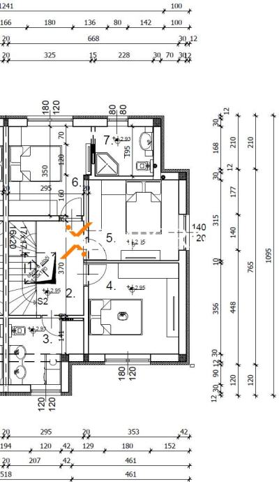 The house consists of two floors. The ground floor consists of a covered entrance, hallway, toilet, kitchen with dining room and living room, stairs to the first floor and a covered terrace. The area of the ground floor is 55,57 m2. On the first floor, there is a hallway, a bathroom and three bedrooms, one of which has its own bathroom. The area of the first floor is 57,39 m2.