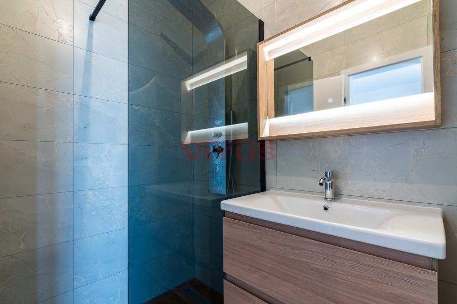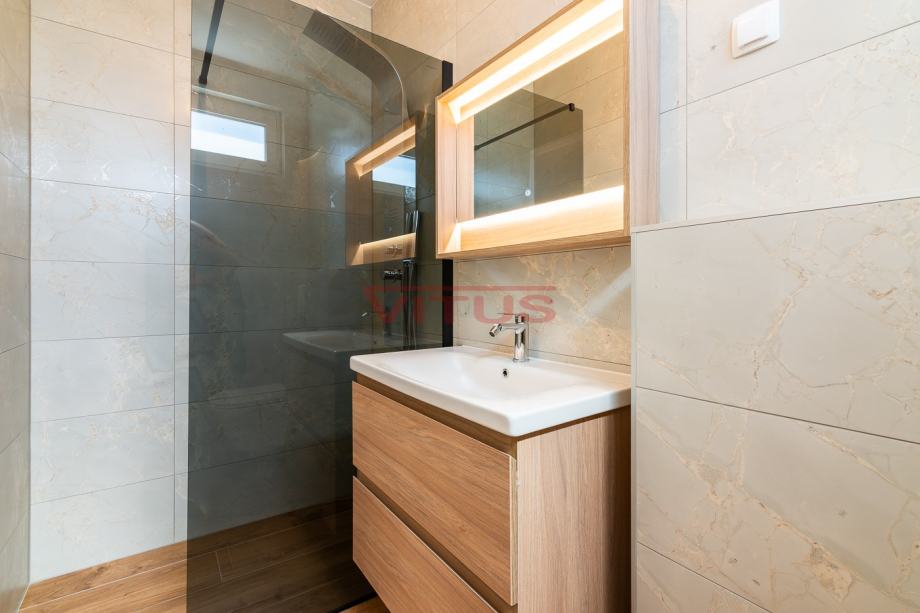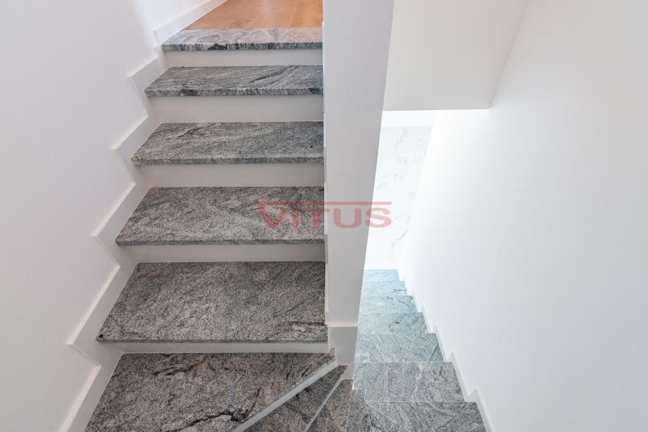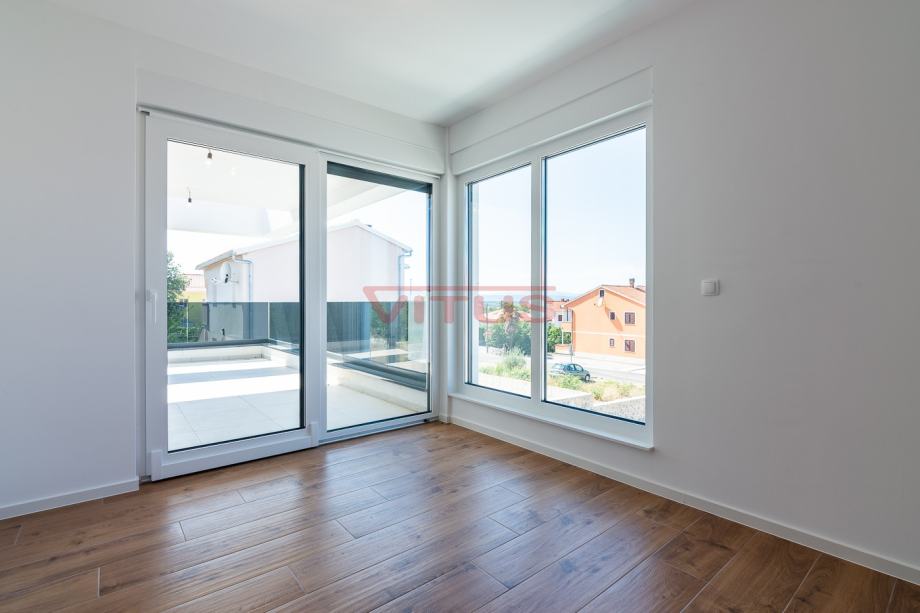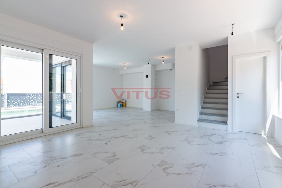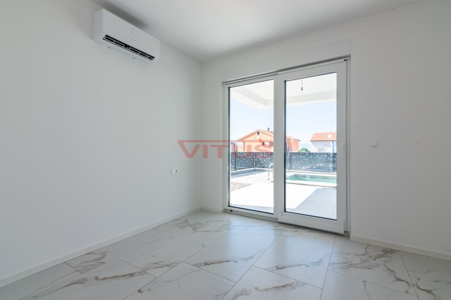 Otok Krk, Malinska! Nova dvojna kuća površine 143 m2 nalazi se na lijepoj lokaciji u Malinskoj, a sastoji se od prizemlja i kata. U prizemlju se nalaze ulazni prostor, kuhinja sa blagovaonicom i dnevnim boravkom, kupaonica i jedna spavaća soba. Iz dnevnog boravka se izlazi na natkrivenu terasu te okućnicu sa bazenom i sunčalištem. Na prvom katu se nalaze tri spavaće sobe, svaka sa vlastitom kupaonicom, te terasa sa pogledom na more. Kvalitetna gradnja i oprema koja uključuje: kvalitetnu keramiku i sanitarije, multi split klimatizaciju, podno grijanje na dizalicu topline, protuprovalna vrata i dva parkirna mjesta na okućnici. Odlična lokacija, 650 m od mora i centra Malinske! Nekretnina je u sustavu PDV-a, kupac ne plaća porez na promet nekretnina!