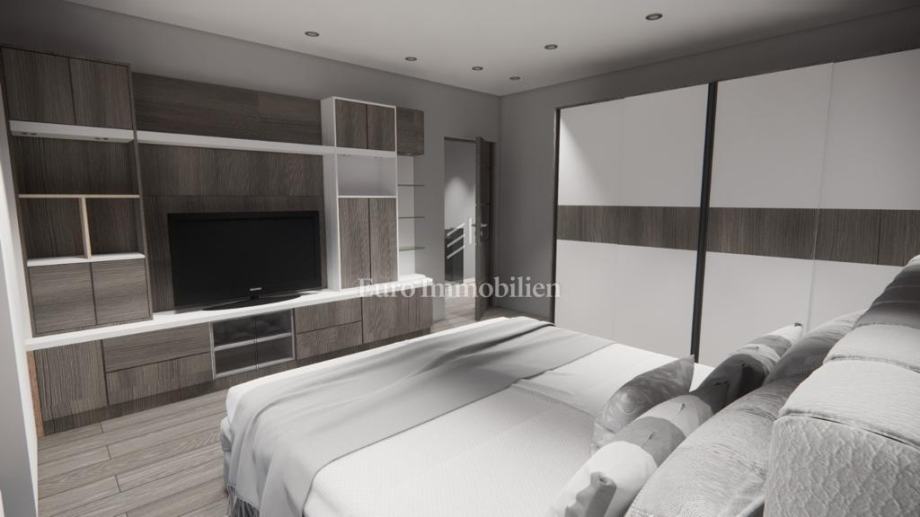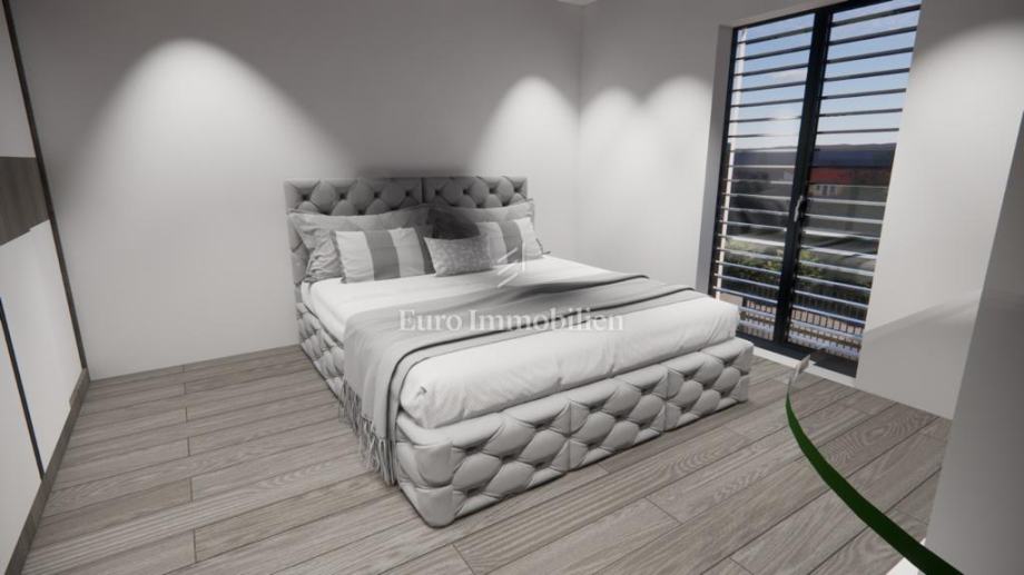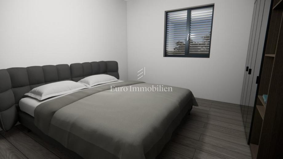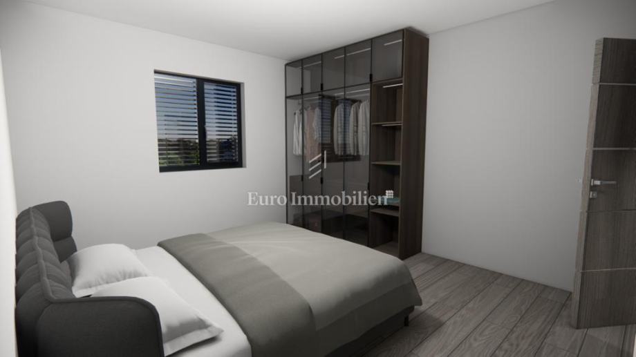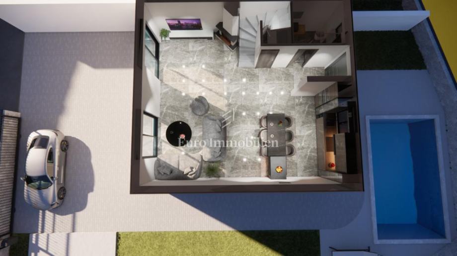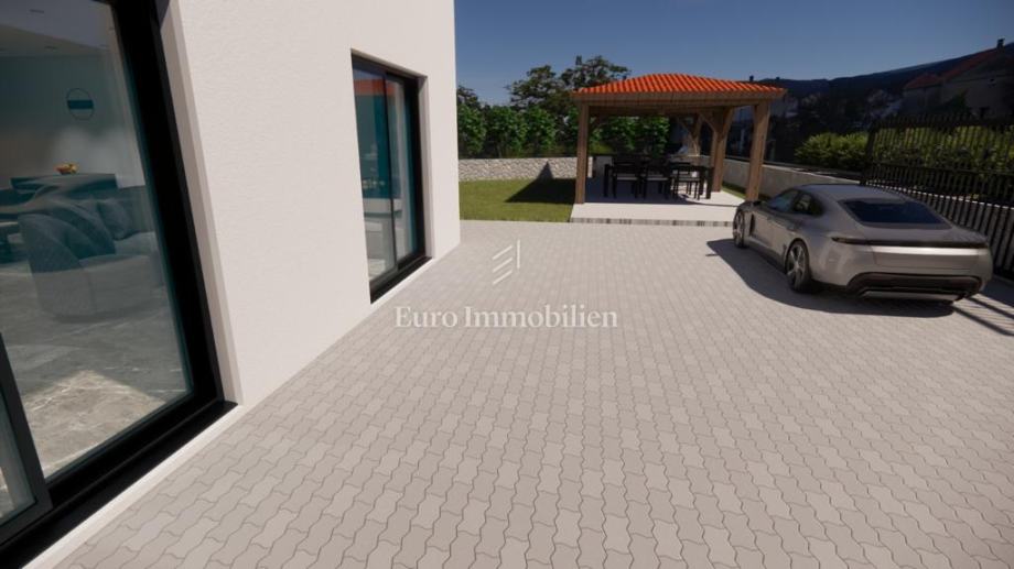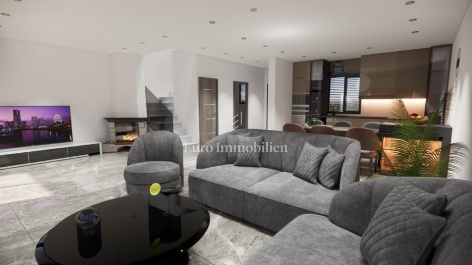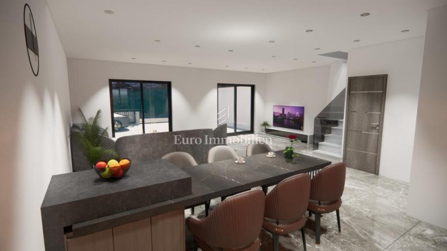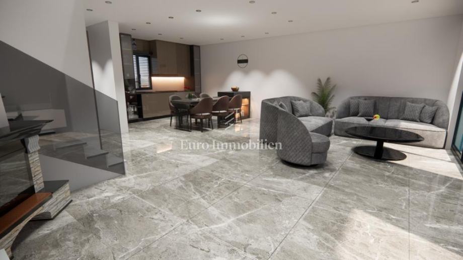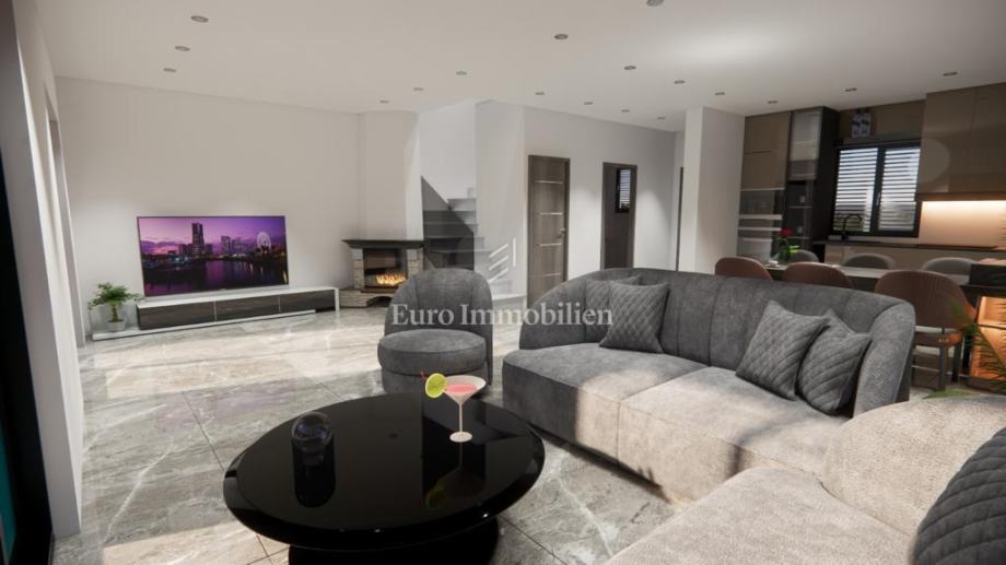Kuće površine 135 m2 se proteže na prizemlje i kat. Prizemlje se sastoji od dnevnog boravka, kuhinje, blagovaonice, WC-a, hodnika i spremišta, a na prvom katu su tri spavaće sobe i dvije kupaonice. Na okućnici je planiran bazen i natkriveni vanjski roštilj. Na raspolaganju su tri parkirna mjesta.