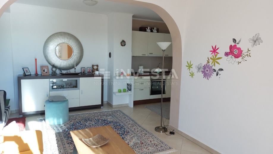 Kat kuće donosi prozračan i svijetao stan s dnevnim boravkom koji se otvara prema prostranoj terasi – idealnom mjestu za jutarnju kavu ili večernje opuštanje uz pogled na more. Uz dnevni prostor nalaze se blagovaonica, kuhinja, kupaonica i spavaća soba, čineći cjelinu praktičnom i ugodnom za boravak.