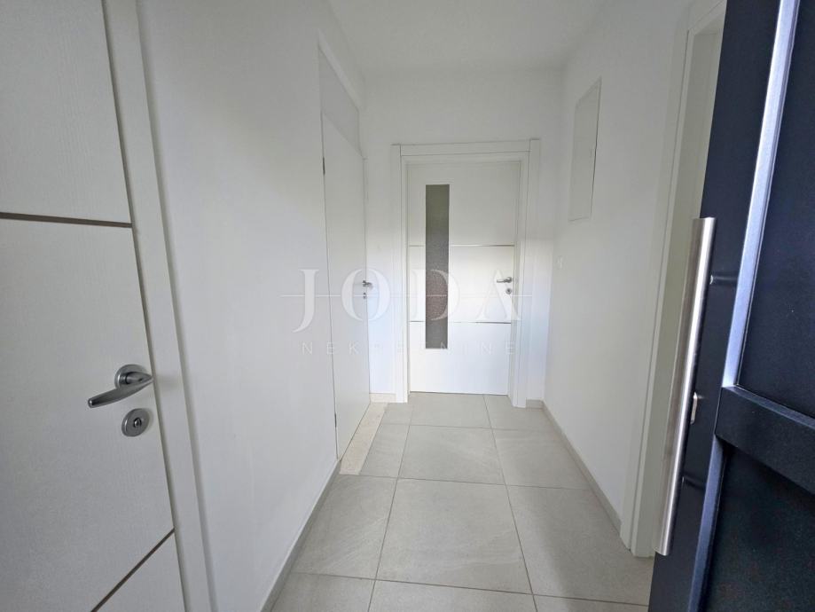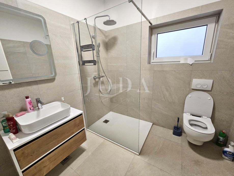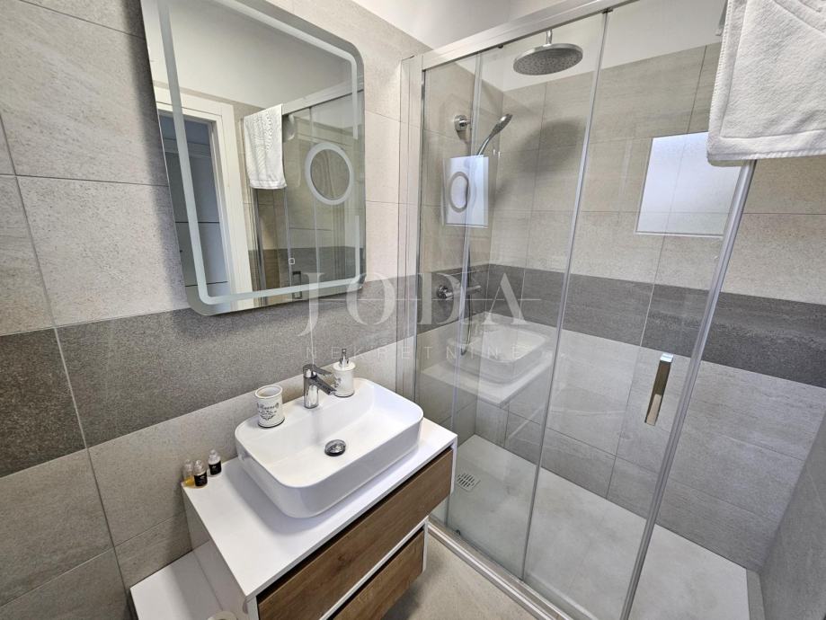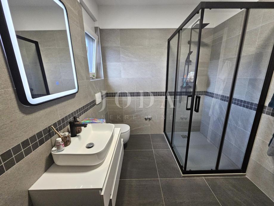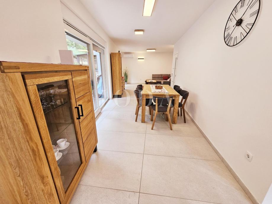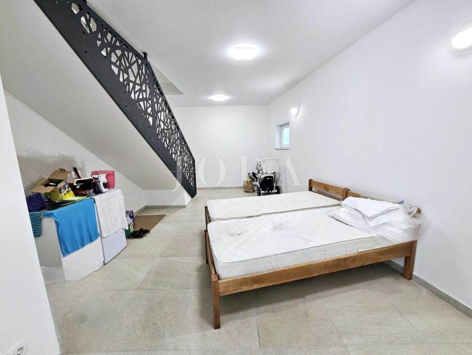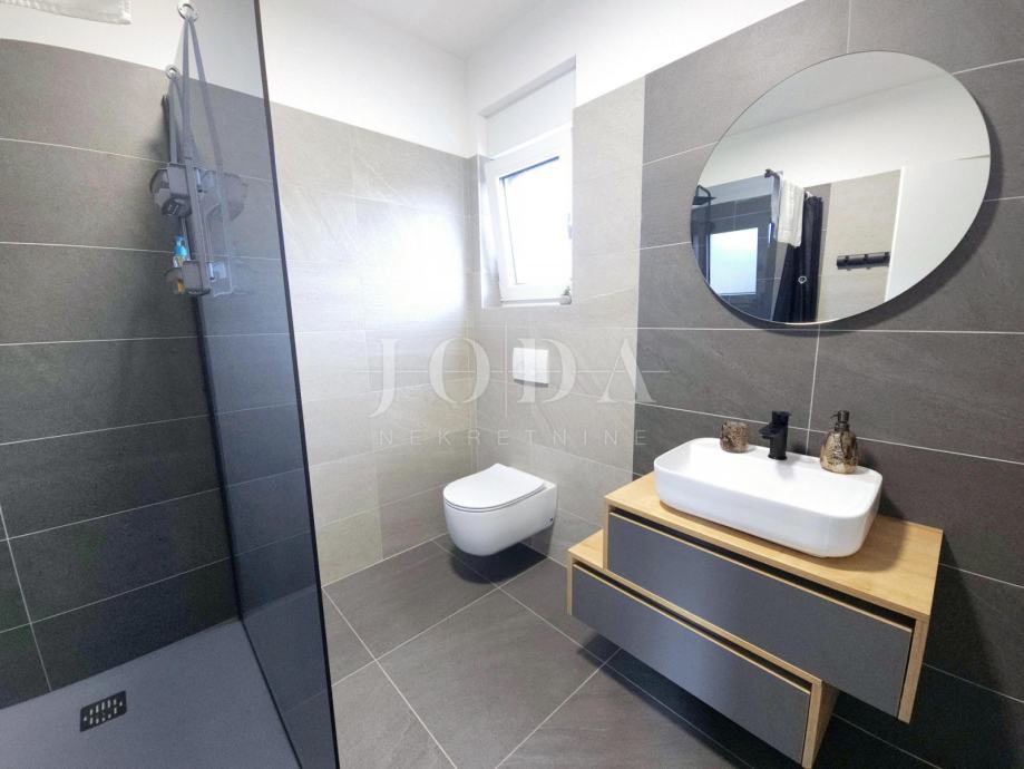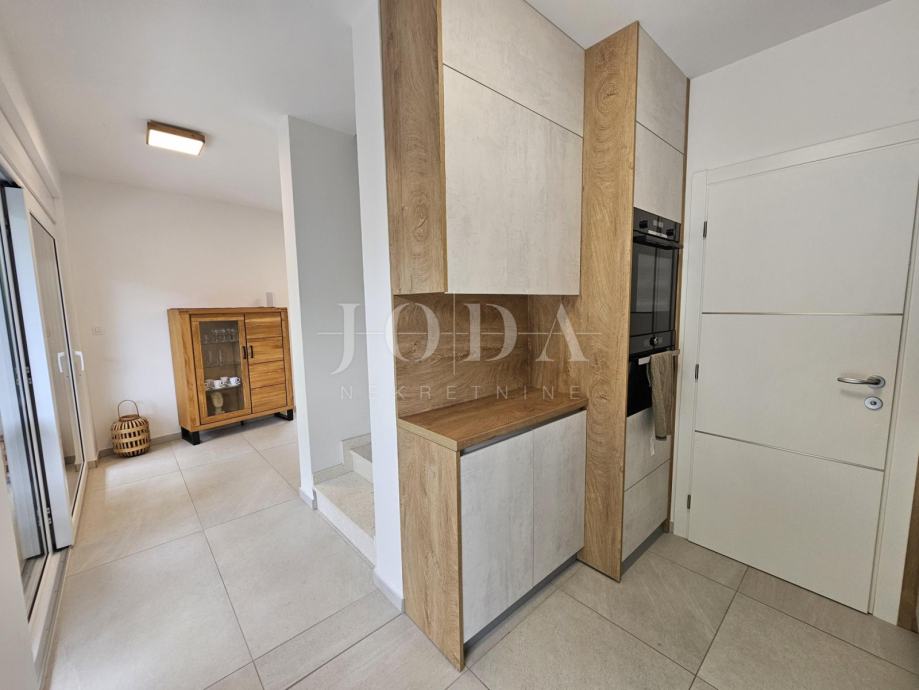 Kuća ukupne stambene površine 198.11 m2 s terasom u prizemlju površine 18,11 m2 i balkonom na katu površine 24,18 m2 proteže se na dvije etaže prizemlje i kat. Ima dva ulaza, jedan je kroz garažu, a drugi vanjskim stepenicama. U prizemlju se nalazi garaža, spremište i konoba koja je uređena kao studio apartman s kupaonicom, terasom i vlastitim ulazom. Unutarnjim stepenicama dolazi se na gornju etažu, koja je podijeljena na dva dijela. Prvi dio je veći, a sastoji se od dvije spavaće sobe, kupaonice, kuhinje s blagovaonicom i dnevnim boravkom, te balkona. Drugi dio je manji, koncipiran je kao studio apartman s kupaonicom i mini kuhinjom. Ispred kuće je lijepo uređena okućnica površine 222 m2. Na raspolaganju je parking za tri vozila.