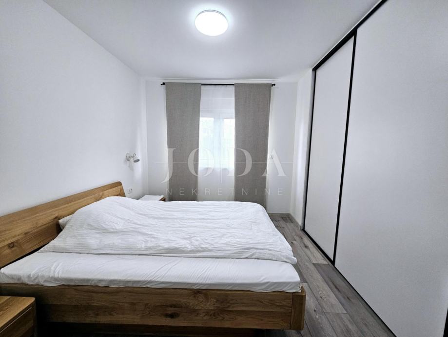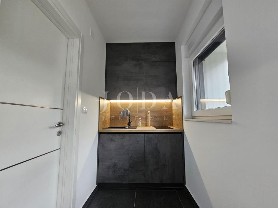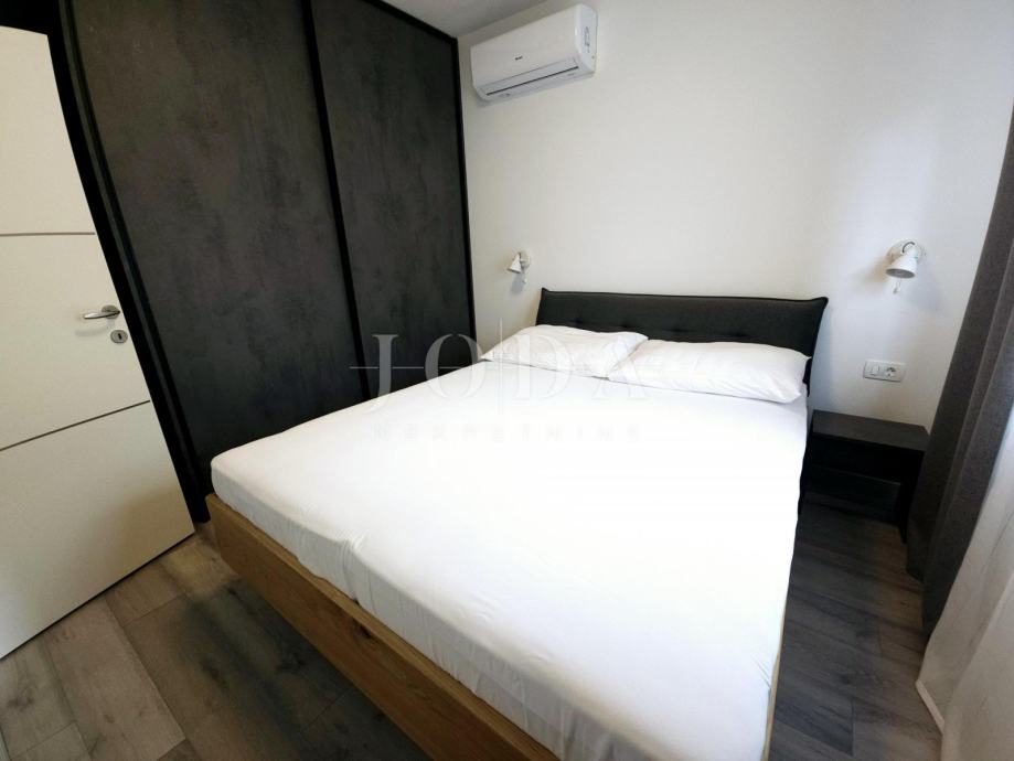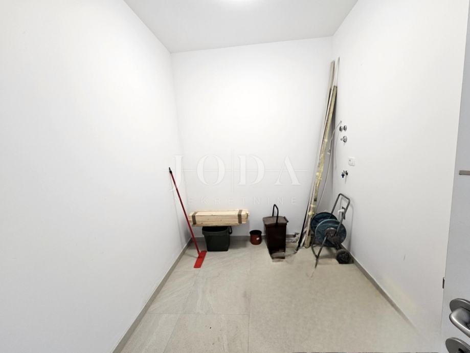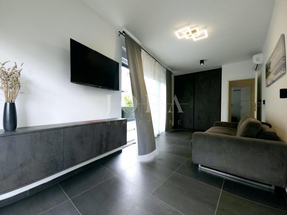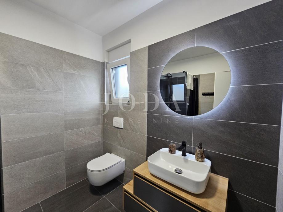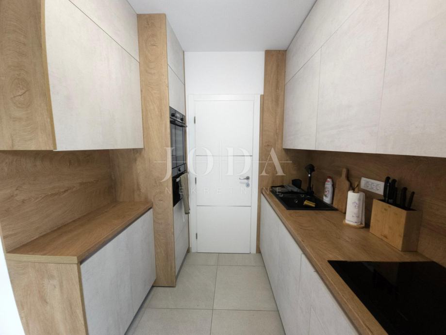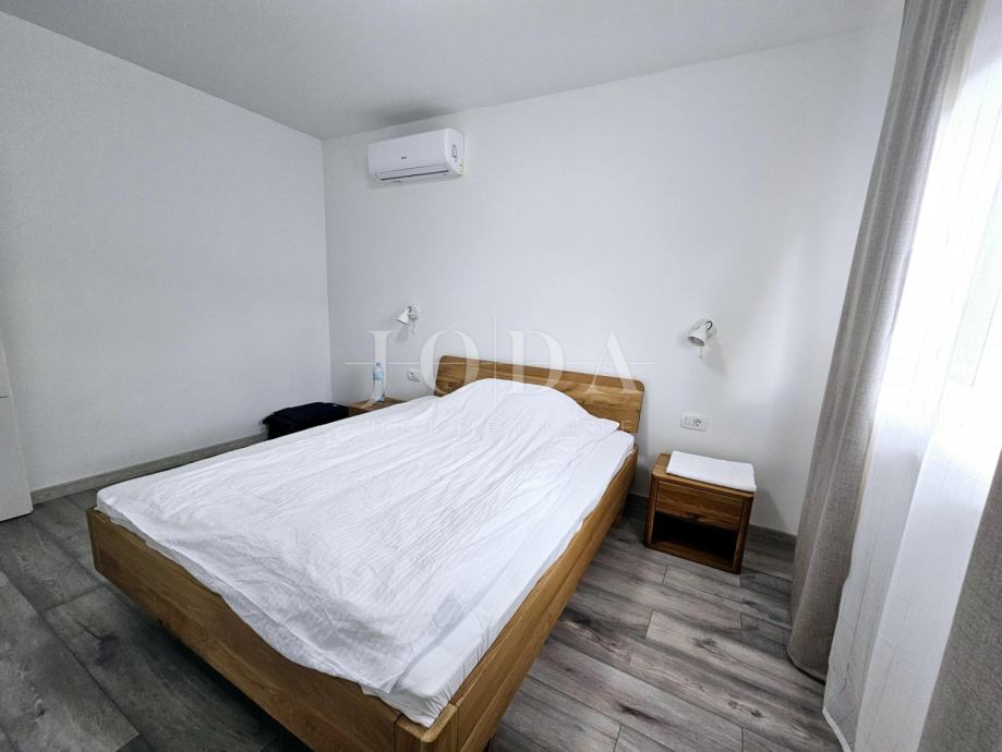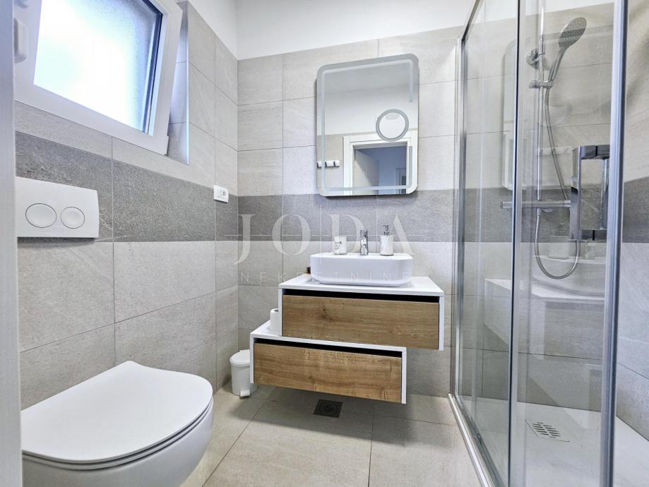 Kuća ukupne stambene površine 198.11 m2 s terasom u prizemlju površine 18,11 m2 i balkonom na katu površine 24,18 m2 proteže se na dvije etaže prizemlje i kat. Ima dva ulaza, jedan je kroz garažu, a drugi vanjskim stepenicama. U prizemlju se nalazi garaža, spremište i konoba koja je uređena kao studio apartman s kupaonicom, terasom i vlastitim ulazom. Unutarnjim stepenicama dolazi se na gornju etažu, koja je podijeljena na dva dijela. Prvi dio je veći, a sastoji se od dvije spavaće sobe, kupaonice, kuhinje s blagovaonicom i dnevnim boravkom, te balkona. Drugi dio je manji, koncipiran je kao studio apartman s kupaonicom i mini kuhinjom. Ispred kuće je lijepo uređena okućnica površine 222 m2. Na raspolaganju je parking za tri vozila.