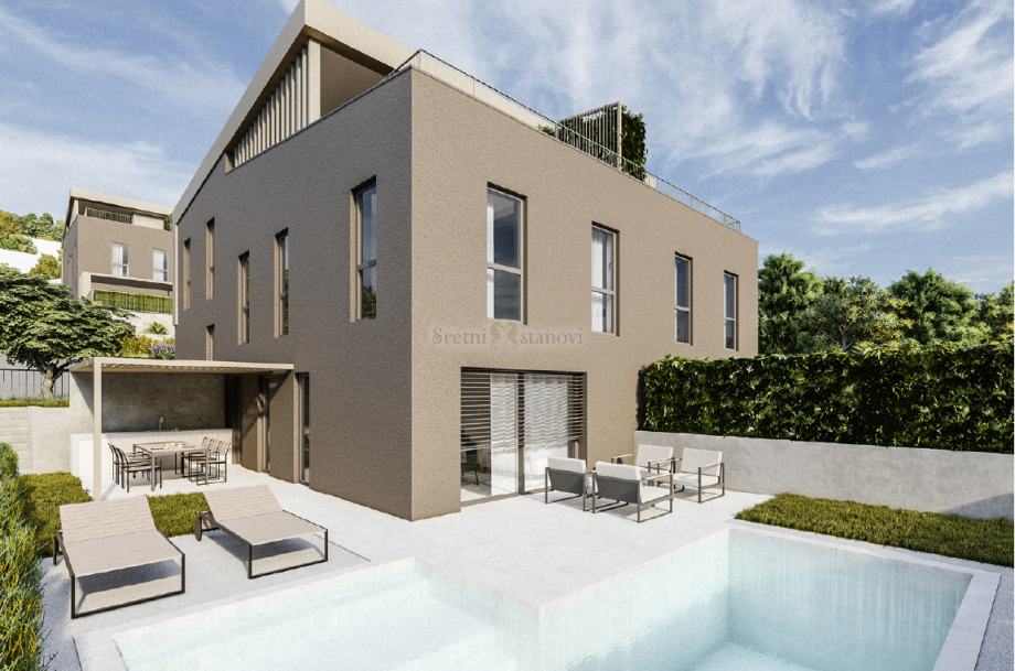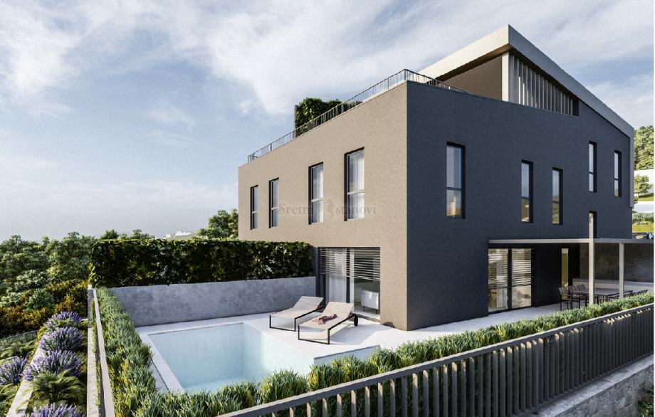 Luksuzna kuća, novogradnja, dvojnica, udaljena svega 500 m od mora, sastoji se od vertikalne stambene jedinice - suterena, prizemlja, 1. kata i krovne terase, vanjske terase s bazenom ili jacuzzijem i okućnice sa zelenilom.