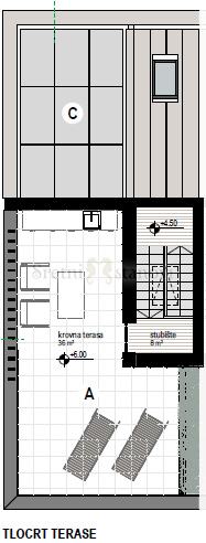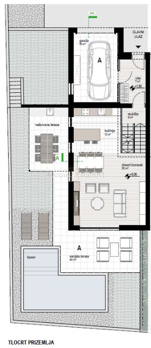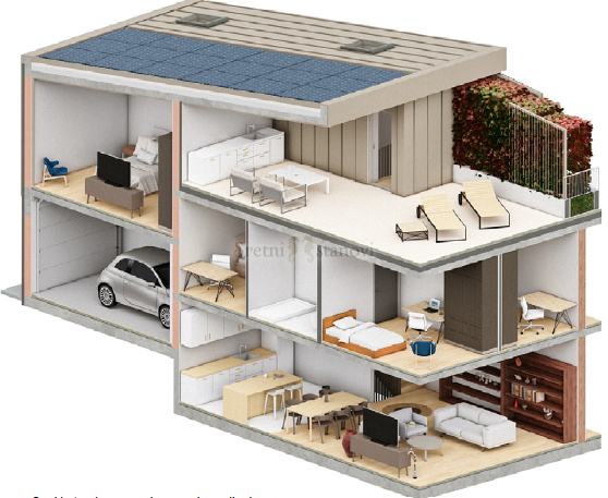 Kuća se sastoji od prizemlja i 2 kata, stambene površine 196 m2. U prizemlju se nalazi kuhinja i dnevni dio s izlaskom na okućnicu. Na 1. katu su 3 sobe, 1 kupaonica, master soba sa svojom privatnom kupaonicom i garderobom. Krov je izveden jednim dijelom u obliku krovne terase a drugim dijelom je zatvoren krovištem na kojem je smještena fotonaponska elektrana što čini kuću energetski neovisnom. Grijanje, hlađenje, svi kućanski aparati i u garaži utičnica za punjenje električnih automobila povezani su krovnom toplanom.