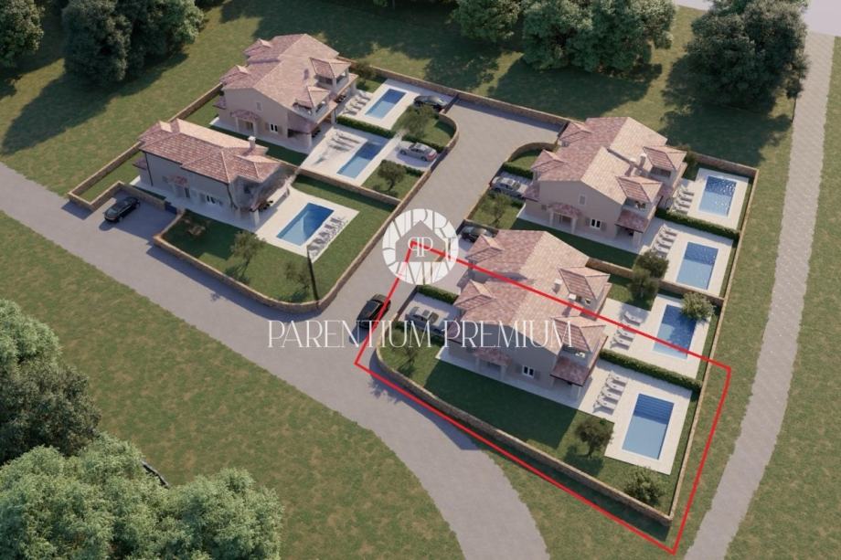Prodaje se dvojna Kuća s bazenom, panoramskim pogledom na more i istarski krajolik. Kuća se nalazi u mirnom mjestu na parceli od 543m2.