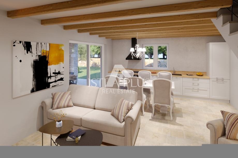 Prizemlje kuće sastoji se od ulaznog hodnika, spavaće sobe s vlastitom kupaonicom, gostinjskog WC-a, spremišta, prostranog dnevnog boravka, kuhinje i blagovaonice sa izlazom na natkrivenu terasu s vanjskom kuhinjom, gdje se nalazi bazen i lijepo uređen vrt.