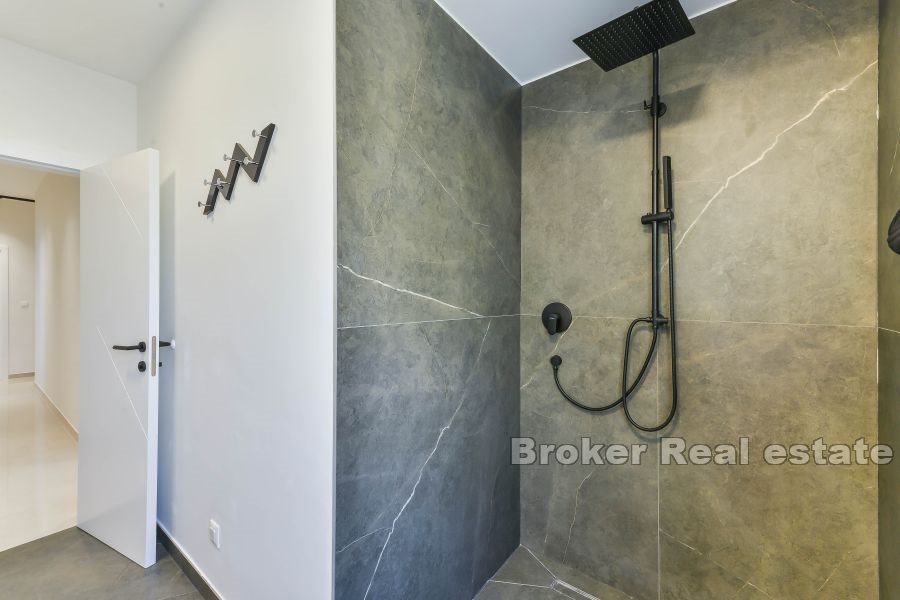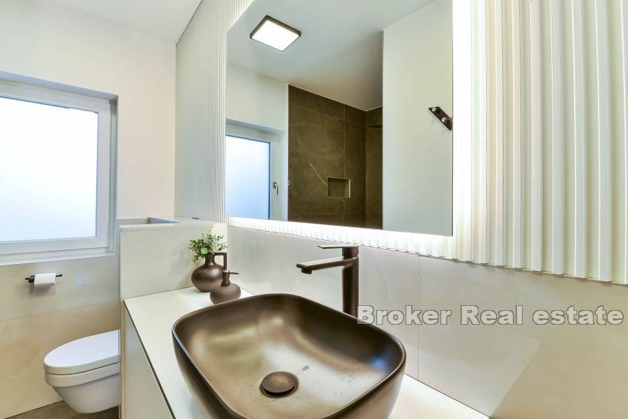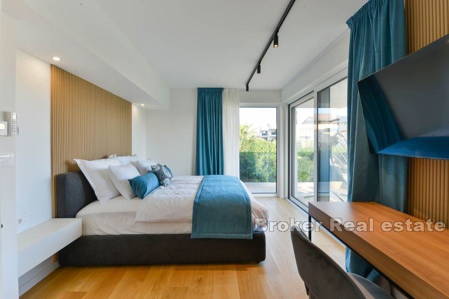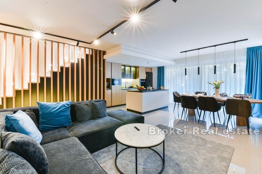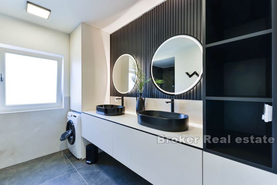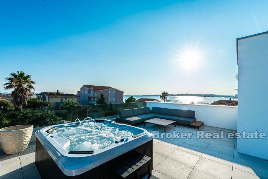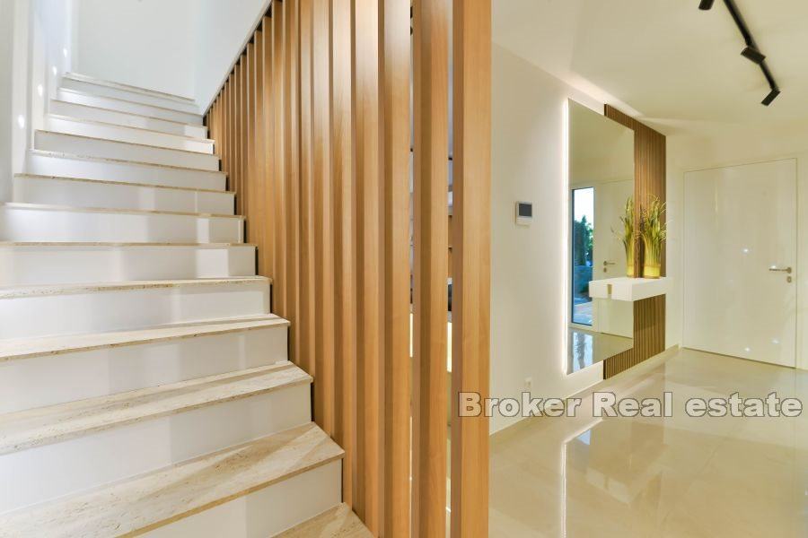 Nekretnina je raspoređena u 3 etaže. U prizemlju se nalazi veliki dnevni boravak, kuhinja, blagovaonica i velika terasa od 40 m2. Na prvome katu se nalaze 4 luksuzno uređene sobe i dva kupatila. Neke od soba imaju i izlaz na veliku terasu koja ima prekrasan pogled na more. Na 3. etaži se nalazi krovna terasa ukupne površine 85 m2. Na terasi se nalazi ljetna kuhinja, jacuzzi i prostor za opuštanje. Cijela nekretnina uređena je modernim i luksuznima namještajem.